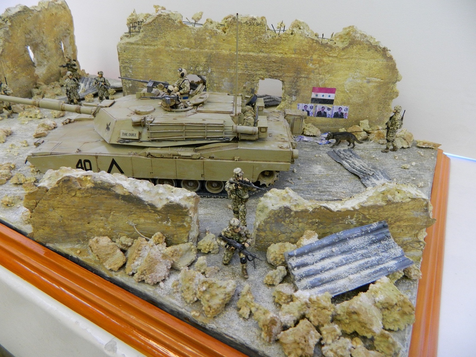 Описание работы, конечно, радует... Как в передовице... Что-то никто ничего не пишет. Может, тема не популярна... Несколько раз рассматривал Вашу работу... Издалека смотрится очень неплохо, но при близком рассмотрении видны некоторые огрехи, такие как фактура пенопласта, песок больше похож на щебень, на фигурах виден облой. Танк отдельная тема для рассмотрения, в матчасти несилён, но тонировка (если это конечно тонировка) сделана не очень аккуратно. Режет глаз глухие пулемётные стволы... Если - это Ваша первая работа, то хорошо, всё придёт с опытом. Удачи!!! PS:продать будет очень сложно такую работа, если отбить хоть какую-то сумму, но здесь... Радует портрет Саддама Хусейна ...