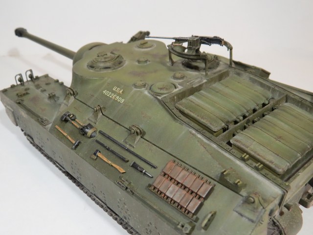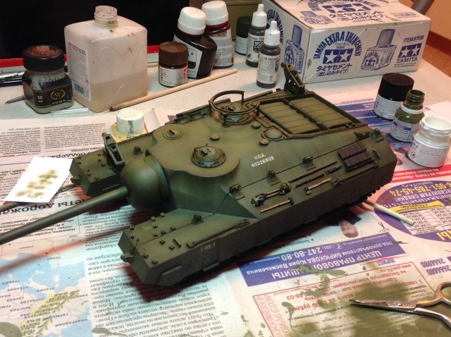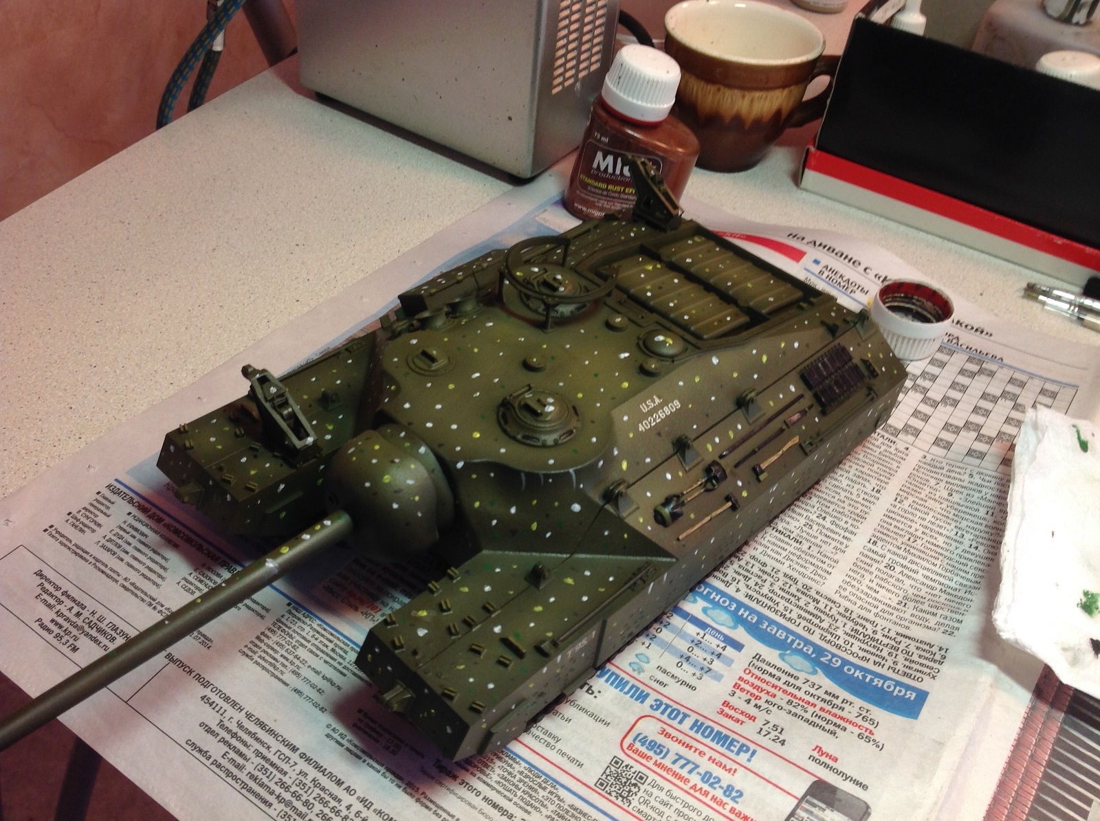 Красил я его акрилом Tamiya(XF-60 Olive drab)-базовый цвет, выстветления-(XF-62 Olive drab+XF-57 Buff);фильтры,маслянные точки с помощью масла неизвестного производителя,смывка-MIG;сколы-краска Vallejo (70822);ржавые потеки-миг,пигменты-Wilder(на ходовой делал фиксером,на корпусе пыль втирал насухо)Следы масла на катках-Дизель Эффект от Wilder,нагар и копоть-ZIP maket (сажа) грани и пулемёт натер до металла пигентом металлик от MIG