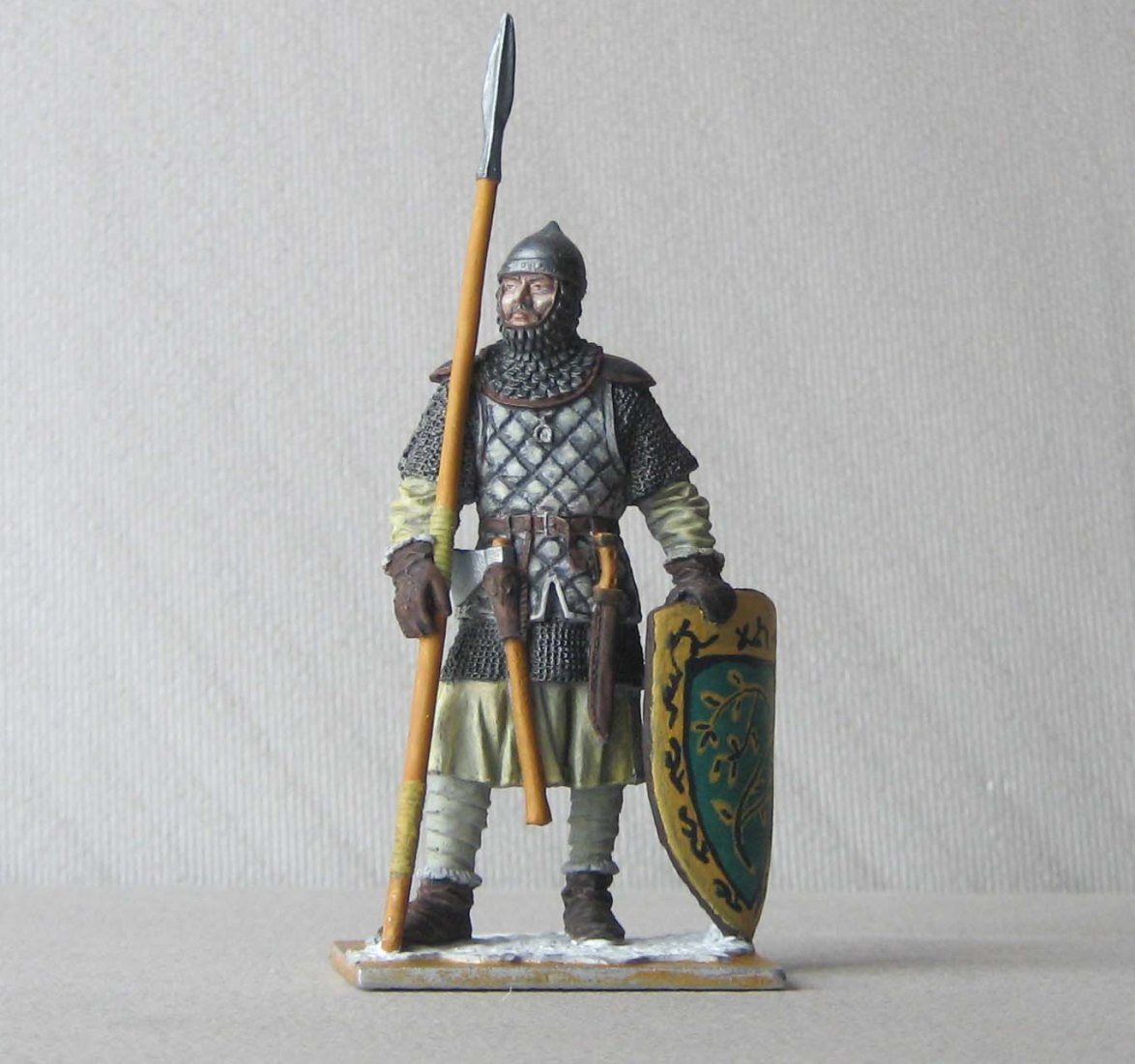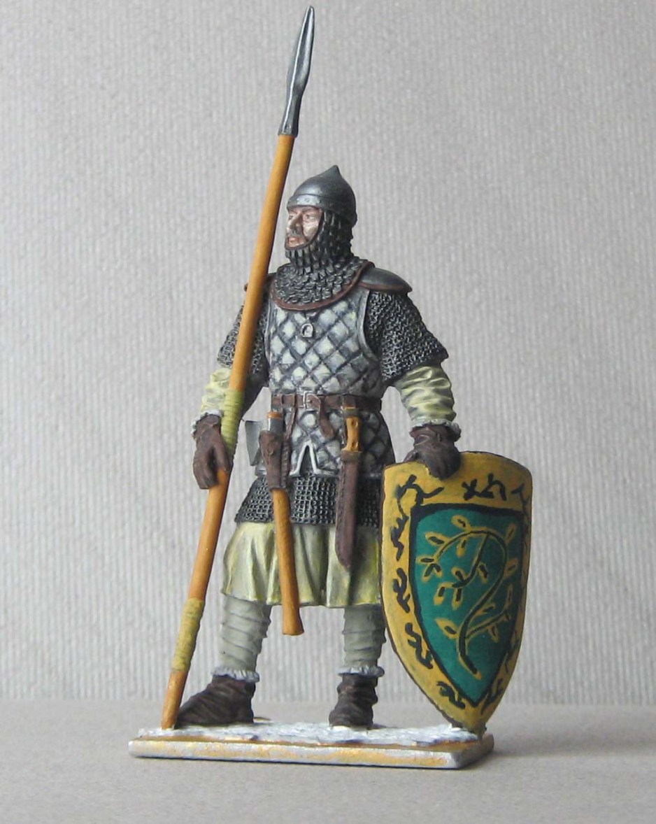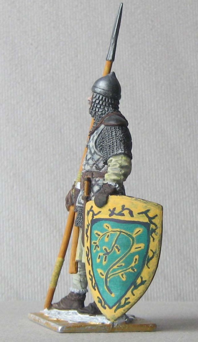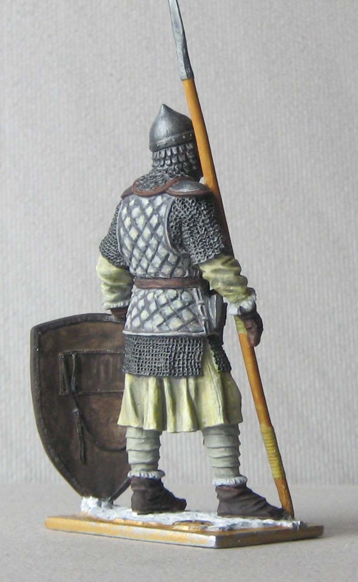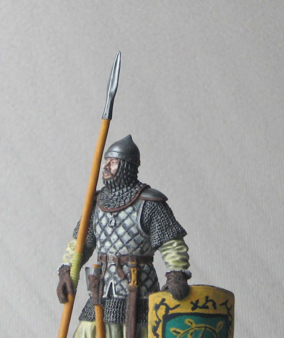 теней нет совсем. Ну, не знаю, возьмите смывочку (масло сажу, уайт и капельку льняного масла), пройдитесь смывкой по кольчужным и металлическим частям. Все остальное не трогать. через минут 15 пройдитесь кистью с уайтом (без фанатизма) убрать только лишнюю смывку или участки, где перелили смывку. еще через 15 минут сухой кистью с светло-серыми оттенками по той же кольчуге, только аккуратно, и сначала на незаметном участке пробуйте. Краски на широкую кисть брать совсем мало, лучше сделать 100 взмахов, чем запороть.