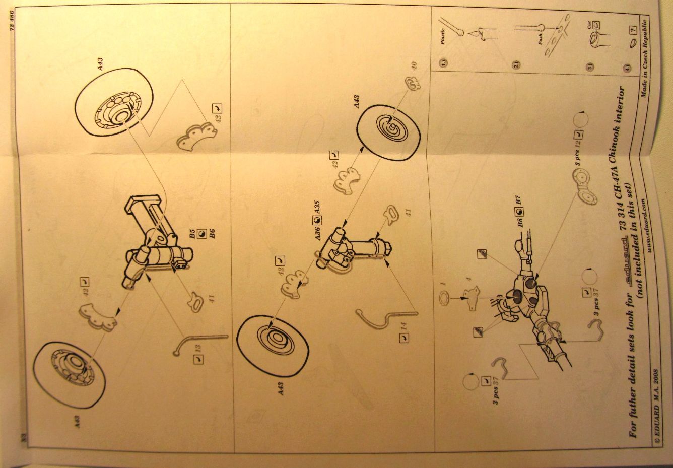в наборе одна плата травленых деталей. набор позволяет детализировать фюзеляж, стойки шасси и самое главное двигатели вертолета. ну и инструкция по размещению этих деталей на модель.