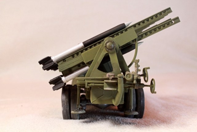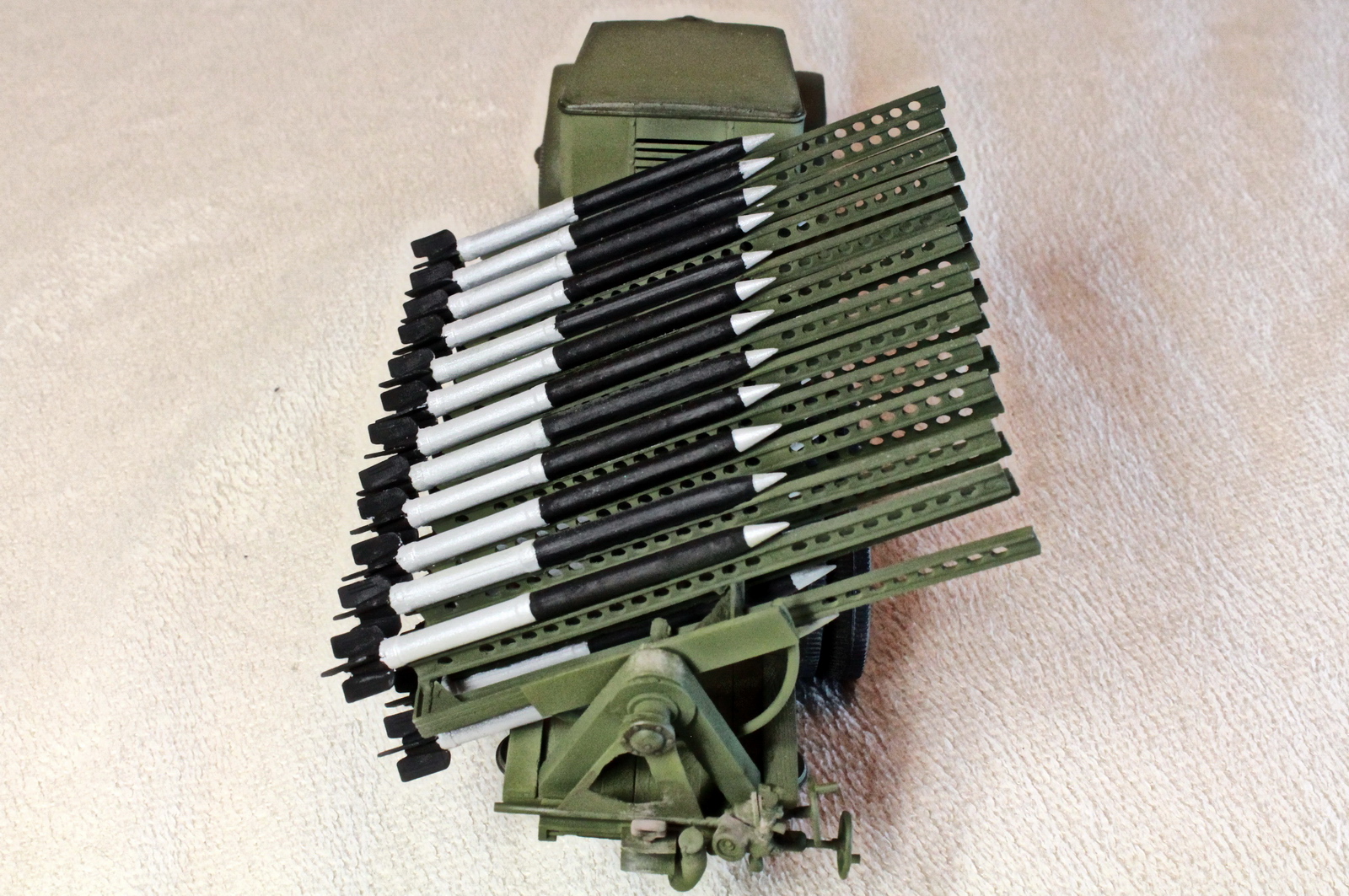 Использовать в данном случае направляющие от алановкаой Катюши не корректно. У данной установки были однопланочные направляющие желобкового типа (аналогичные по конструкции авиационным). К тому же визуально они получились длиннее чем на фотографиях (на прототипе вроде как 2-х метровые направляющие были). У самих РС длину наращивали? Ориентировались на схемы или на фото прототипа? Вроде как на фото с полигона по длине вполне себе такие стандартные авиационные РС-132 (принят на вооружение в 1939 г.)