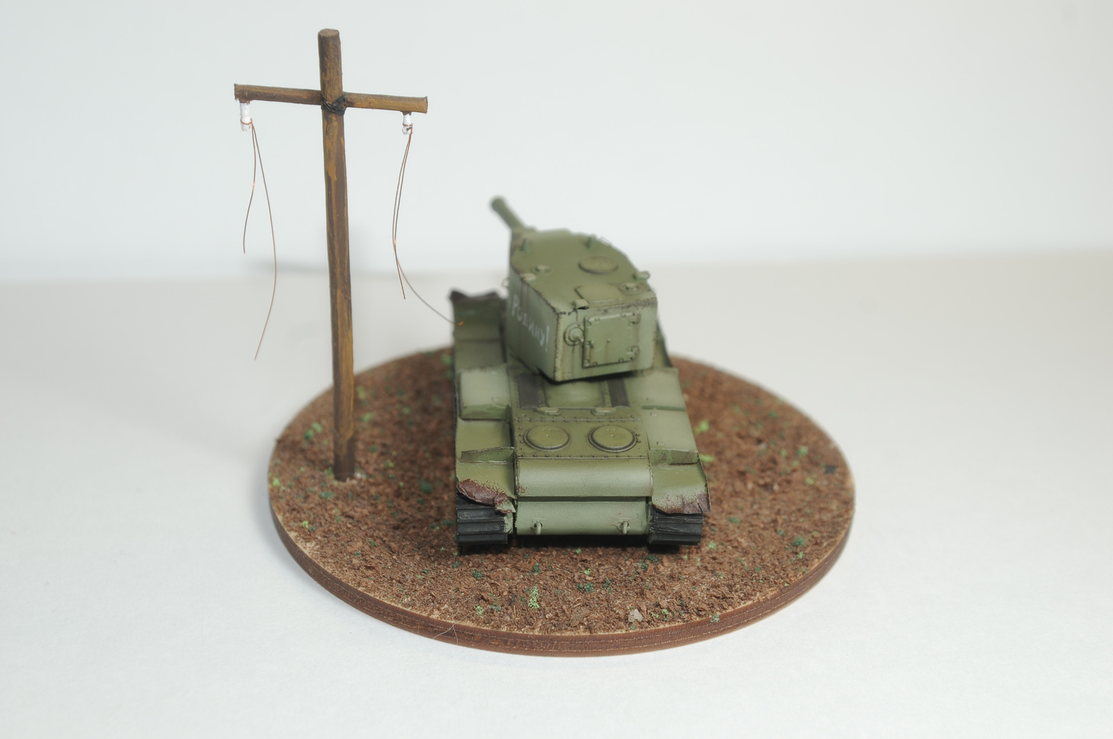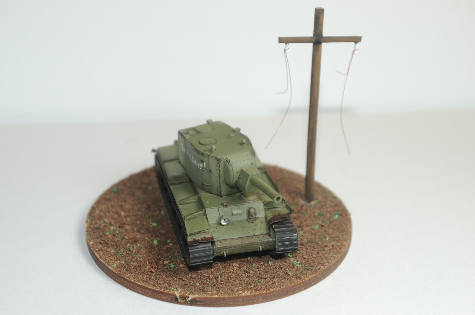 Как любитель не только "клопов" (моделей БТТ от фирмы Звезда в сотом масштабе) но и всяческих запилов оных, решил сделать такой вот КВ-2. Так же сделал для него мини-подставку с одиноким телеграфным столбом.