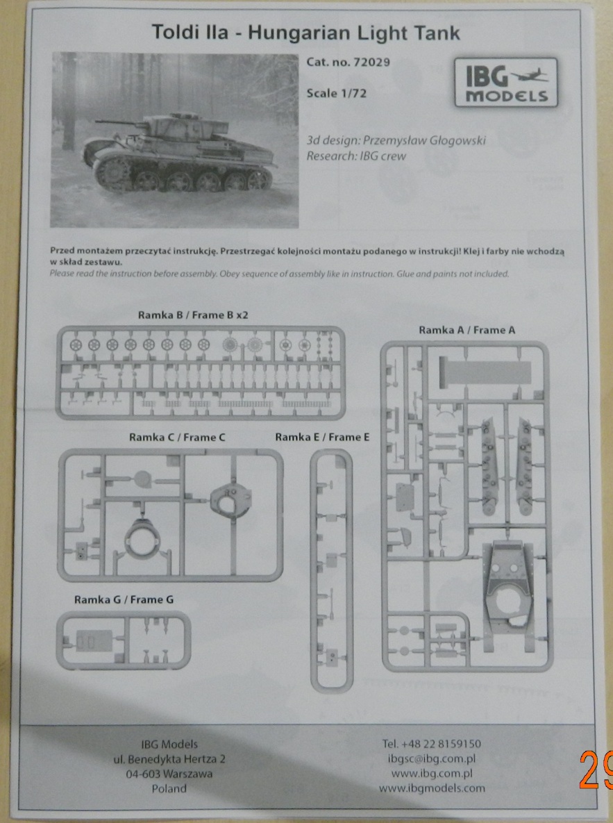 Модель венгерского легкого танка, упакована в большую коробку с хорошей типографией. Внутри пакет с 6-ю литниками из пластика серого цвета и декалью. Качество литников приличное, косяков производителя не обнаружил. Инструкция понятна на одном листе с 4-мя страницами. На замену ствол металлический от Дмитрия 73 "Дyмок72" (Format72).