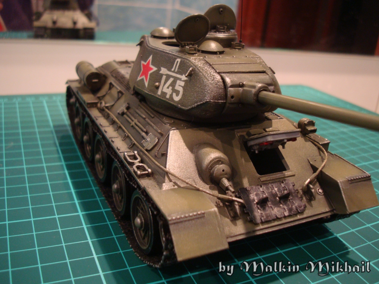 У меня такое впечатление, что декали времён ВОВ, а сам танк уже послевоенного выпуска. Работа смотрится хорошо, но есть досадные огрехи в мелочах.