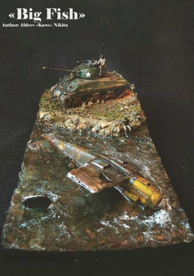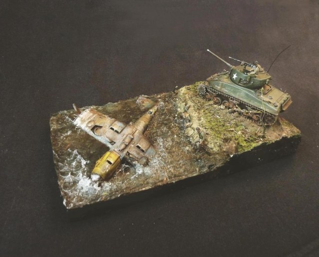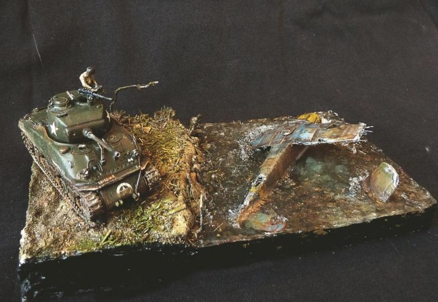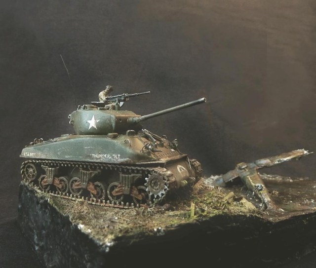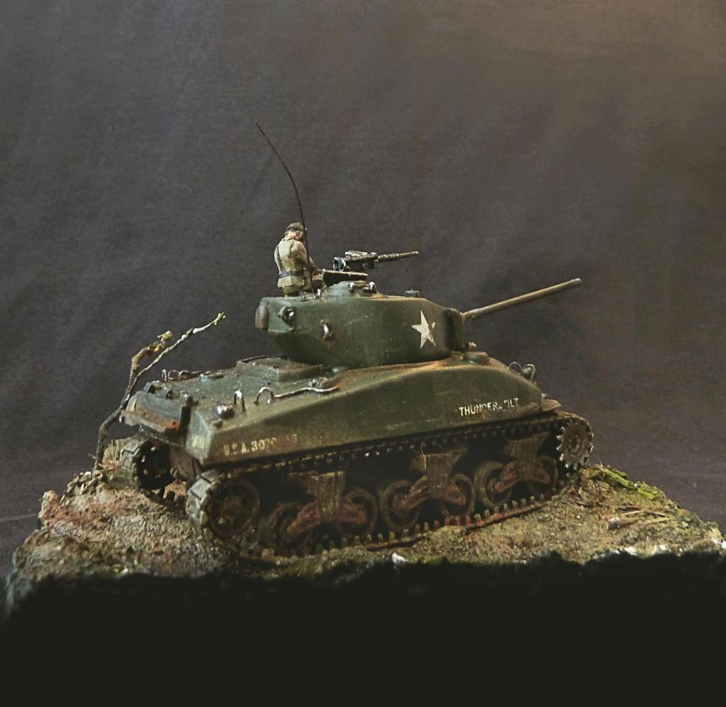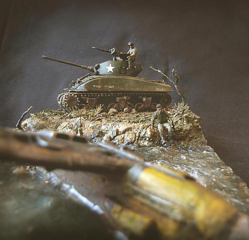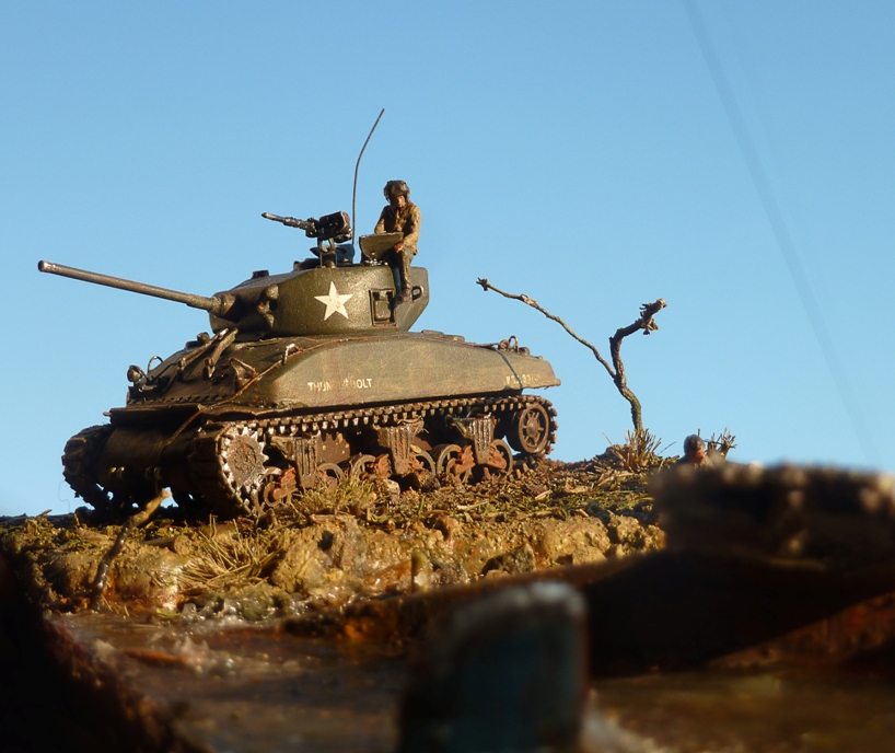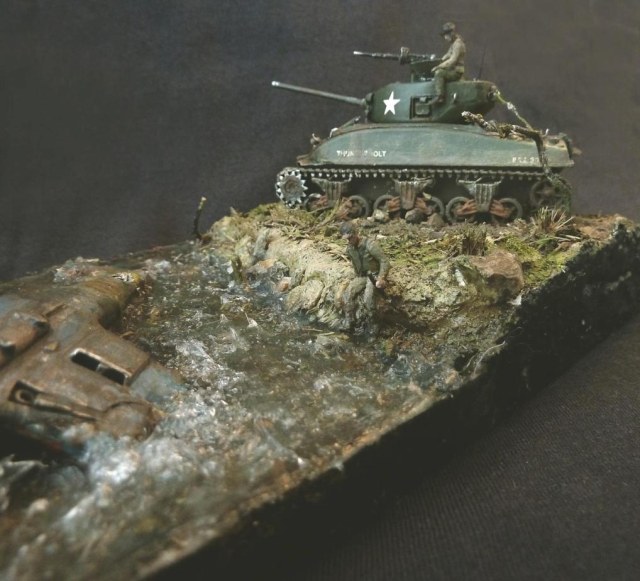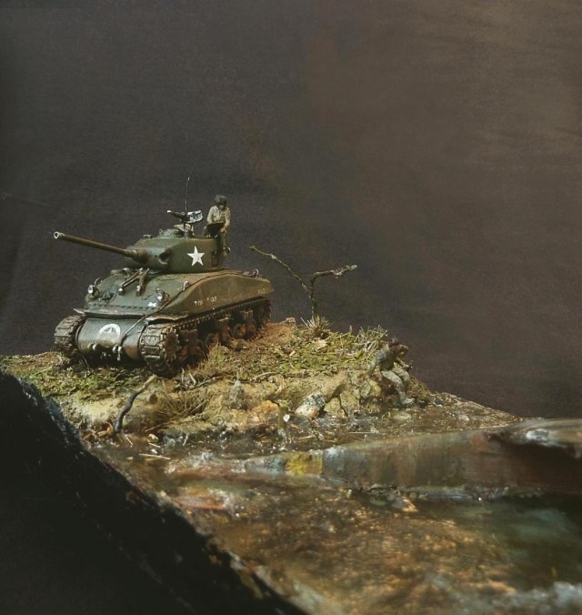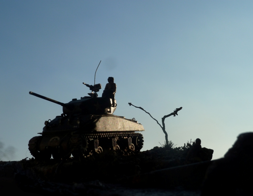 Сюжет был придуман с лёгкой руки товарища, и доработан мной на листке, изначально планировалось застойная озёрная гладь, и советский танк, но почему-то ради интереса взял амерского M4A1 (76) W Sherman от Ревелл и место перенеслось куда-то в европейское лето-осень 44-го возможно район реки Авр, Верхней Нормандии.