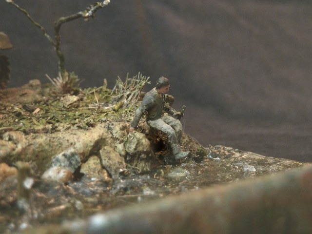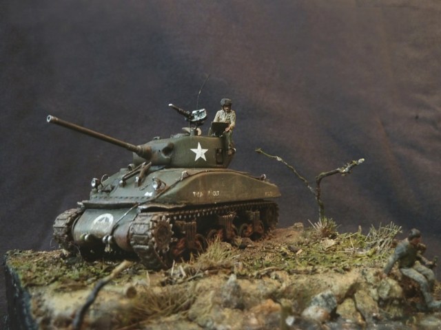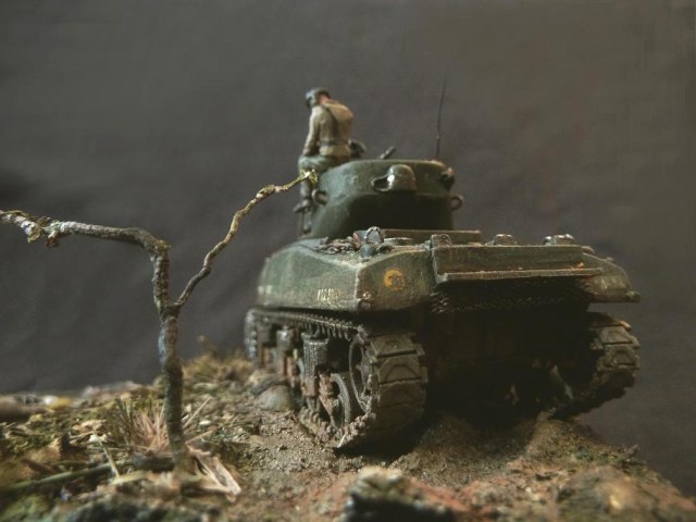 Сборка ревеловского шермана не составила особых трудностей, но если честно то я хотел бы всё это переделать в 35й масштаб с тамиевским шерманом (буду рад если подскажете, может есть лучше кит сией машины), хотелось бы проработать местность по детальней да и сам танк тоже. Я сразу скажу что знаю о некоторых моих недоделках, где-то что-то некомильфо, та и доработок я много не сделал, чуть улучшил короб пулемёта, сделал жестяные передние крылья, и так мелочовку. Грунтонул мистером хобби, окрасил ревелом, смывку мешаю сам.