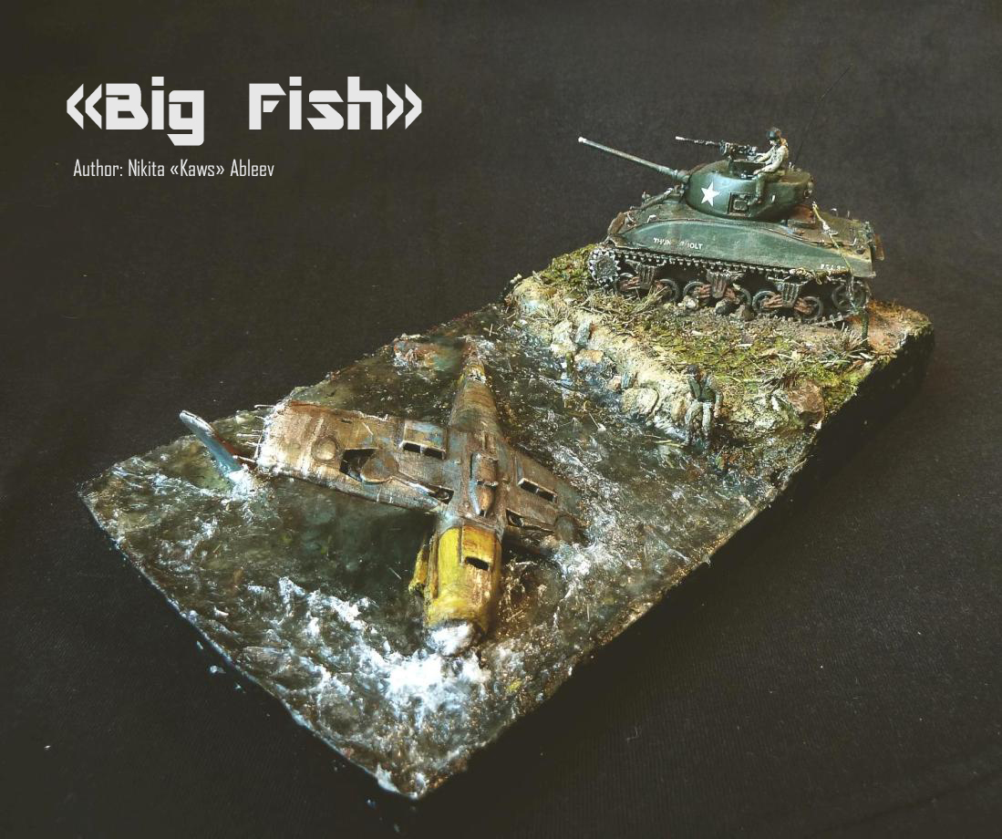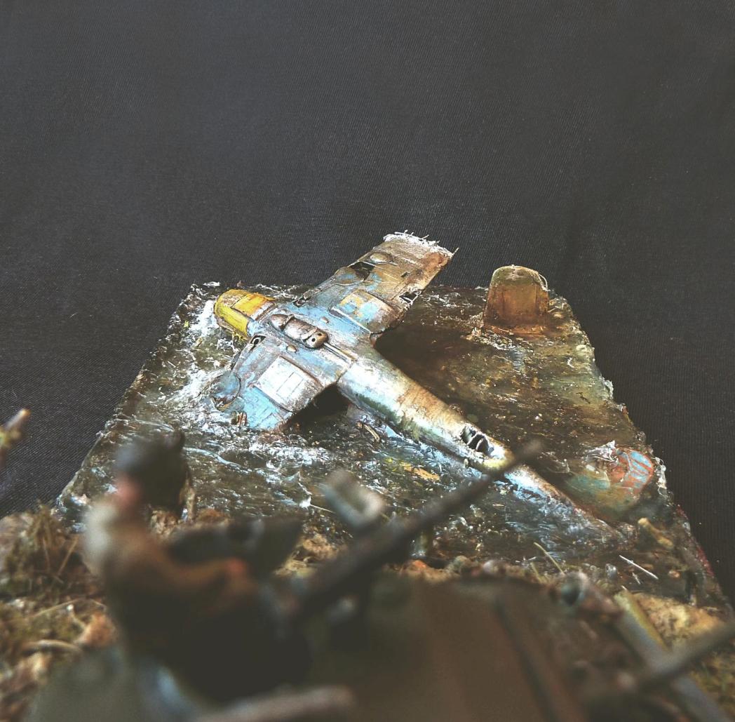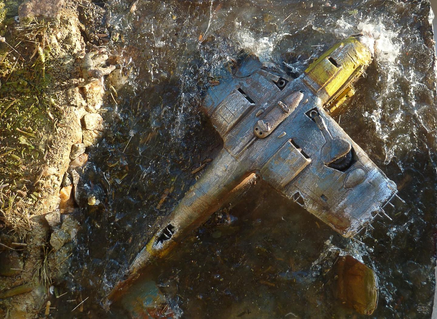 Мессершмит был собран задолго от этих событий не очень качественно, и я решил его кинуть к верху брюхом, так сказать метафоричная отсылка к «дохлым рыбкам». Добавил пару членов экипажа: Командира, наблюдателя, и какого нибудь любопытного радиста, который лезет поближе к "рыбёхе", чтобы рассмотреть её поближе.