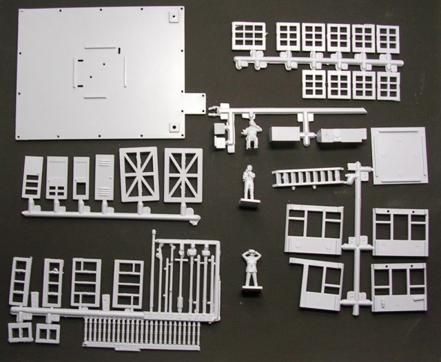 При вскрытии крупные детали рассыпались кучечкой, мелкие остались на фрагментах литников. Пластик «весело» поддаётся ножу и абразивному инструменту. Детали выполнены качественно, без облоя (в основном). На мелочёвке имеются повреждения и следы от толкателей. Оконные блоки естественно без остекления (что впрочем скорее «плюс», чем «минус»).