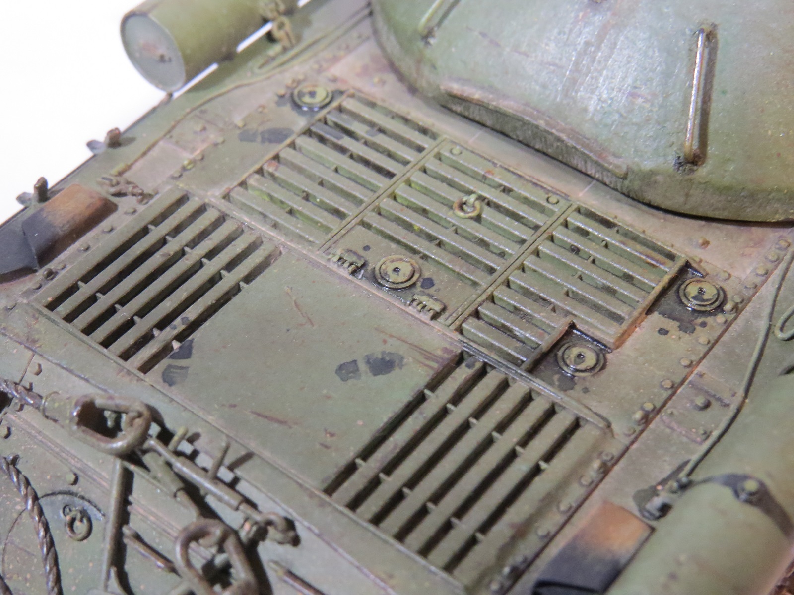 базовый слой из акана 4бо + какая то тамиевская краска(забыл) цветовая модуляция с добавлением белого,фильтр от Вилдера(темный коричневый) лаки от тамии,масялные точки,смывка-Миг,сколы двухслойные-валехо(70822)и светлая желто-зеленая краска тамии(разбавлял на глаз),ржавые потеки-миг,пигменты-Миг,Вилдер,беговая дорожка на траках натерта грифелем,натер пулеметы пигментом металлик(Миг).Копоть и нагар-пигмент сажа(Зип макет)Следы топлива- вилдеровский эффект.Попробовал изобразить отпечатки ботинок экипажа.След отката ствола изобразил грифелем.
