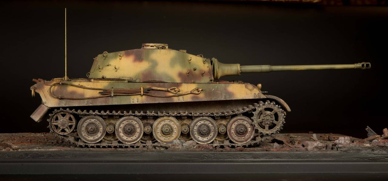 Люблю эти машины!Всегда с интересом смотрю работы коллег над данным зверем.Поскольку вы не привязывались к какому либо прототипу и не углублялись в мат.часть,то нет никакого смысла делать какие либо замечания в этой части работы.По окрасу пару замечаний только.Не хватает немного модуляции для контраста.Насколько я вижу,базовый цвет у вас именно Dunkel Gelb,а на него уже наносились пятна,я правильно вижу?Это видно по тому как работал аэрограф.Если я ошибся,то прошу прощения.Поздний вариант базового должен быть либо красно-коричневый грунт,который начали наносить с начала сентября 1944,либо оливково-зеленый,который наносился с января 1945.Пятна камуфляжа наносились на уже укомплектованную машину с защитными крыльями,а по сему должна быть линия границы где прилегали крылья к бортам,ниже чистый базовый.Выхлопные патрубки немного монотонные и выходные отверстия надо было припорошить сажей,как и дульный тормоз.Темной смывкой более активно проработать сварные швы,головки болтов и т.д.А так хороший зверь получился,подставка в тему!