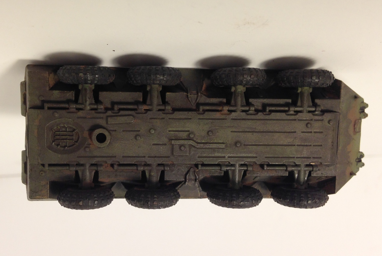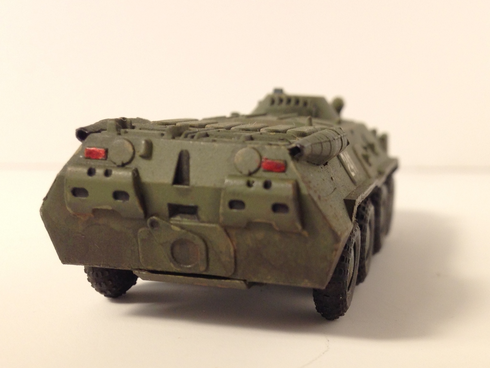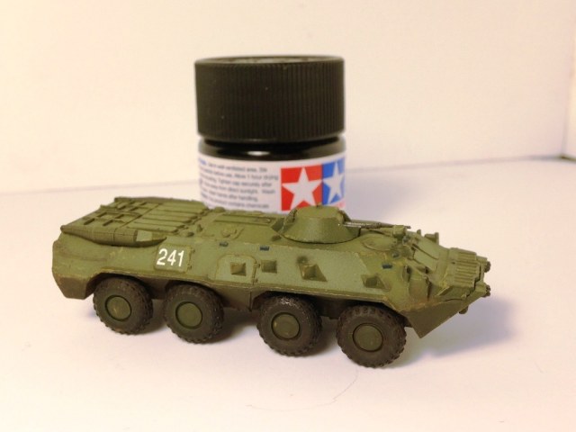 Зачистил качественно, посадил детали на клей, восстановил ствол пулемёта. Покраска: грунтовка tamiya баллон, покраска tamiya акрил из аэрографа, небольшое высветление, сколы, перископы в clear blue, фары в clear red, декали набрал из старого набора сухих, смывка tamiya чёрная, матовый лак, немного пигмента wilder, разводы грязи.