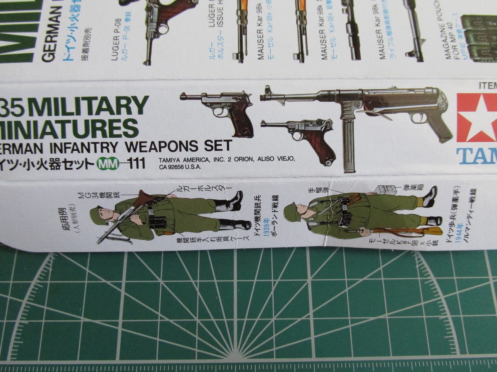 Начну по порядку. Наименование набора – “Germaninfantryweaponsset” артикул ITEM35111**700, 1979 года выпуска, произведено на Филиппинах. Набор упакован в небольшую коробку 170х155х25 мм с боковой загрузкой. На лицевой и обратной стороне изображено содержание литников, частично продублированной на боковых поверхностях, также может служить схемой окраски. На клапанах крышек дано изображение четырёх солдат вермахта в различной форме и вооружением. Инструкция крайне скромна, также в ней есть график, указывающий в какой период и с какого года применялось каждый из представленных образцов. Далее, в обычном поэтиленогом пакете лежат два абсолютно одинаковых литника серо-стального цвета. Сами литники отлиты неплохо. Облой имееться, но не кретично, следы толкателей и швы местами и вполне поправимы. Стыкуемость тех деталей, которые должны стыковаться на первый взгляд неплохая, так или нет, покажет сборка. Копийность весьма неплохая, за исключением кобур, их лучше не использовать, видать это слабое место у Тамии, чётко отлиты мелкие анатомические подробности оружия и снаряжения, но есть один недостаток, который сильно бросается в глаза. О нем в конце.