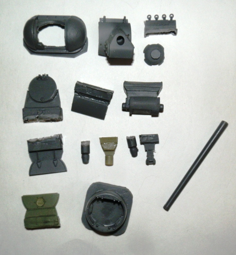 Детали башни упакованы как обычно у данного производителя в небольшой пакетик. Внутри нас ждет небольшая инструкция, верх и низ собственно башни, а также еще один пакетик с мелочевкой-деталировкой башни. Литье из серой смолы, весьма качественное, четкое. Облой только в местах отлива детали. Про стыковку верха и низа башни не скажу, пока не подгонял, но учитывая особенности членения(шов будет не виден), это не сильно беспокоит. Но думаю все будет на уровне. Единственный минус-плохо пролит погон башни, не знаю это брак у меня лично, или особенность данного набора не знаю. Брал в магазине и не посмотрел(. Но это не составит труда нарастить-доработать тем же эпоксилином.