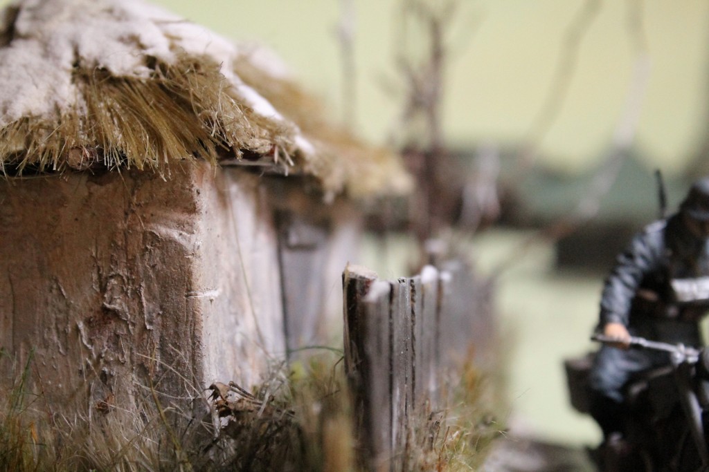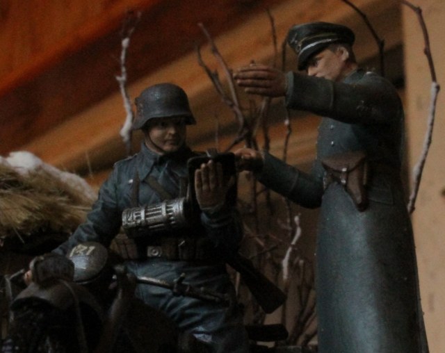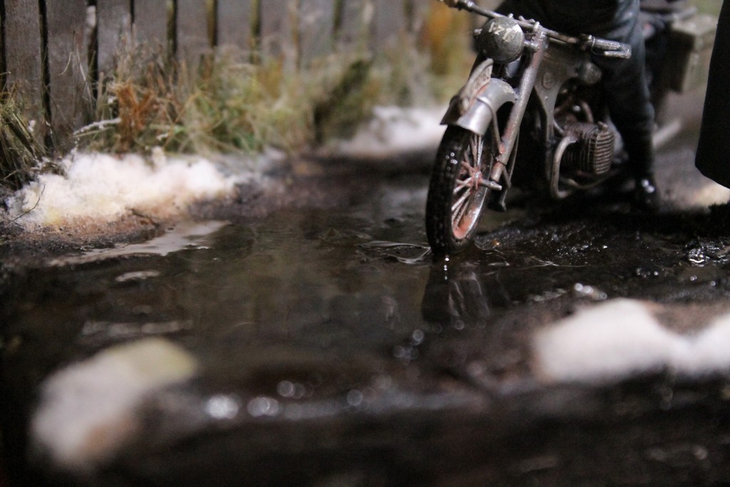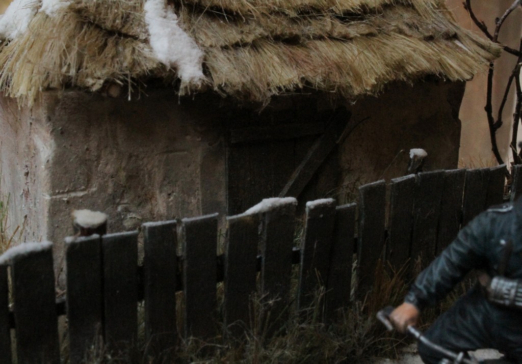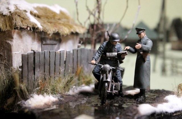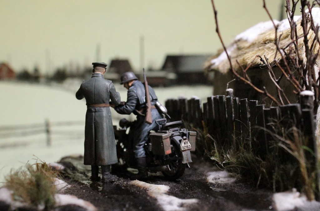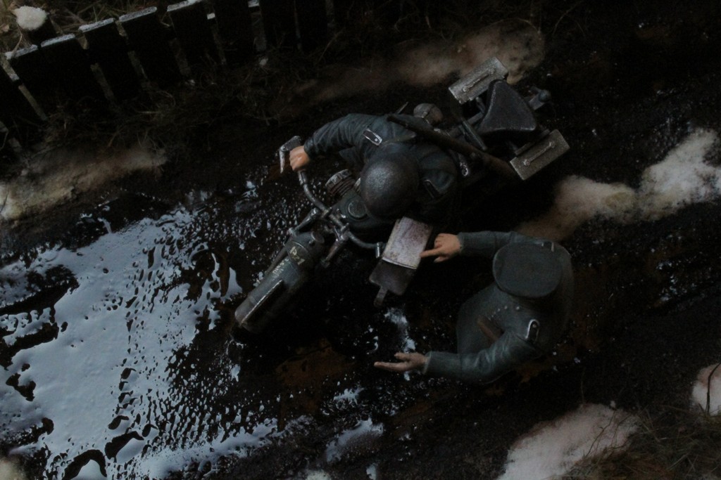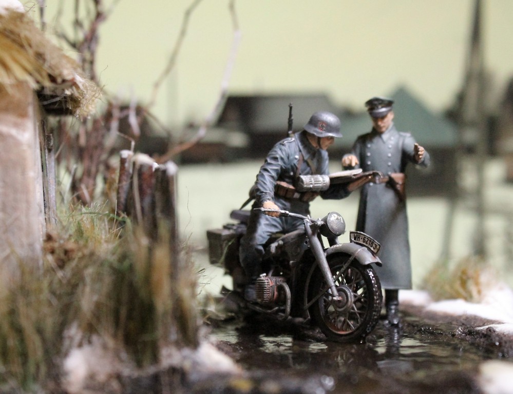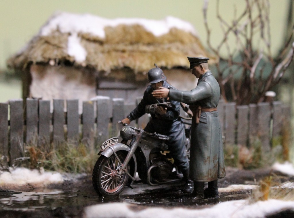 ...Что касается диорамы в целом,то не хватает "свиты" для офицера.Они не ходят поодиночке,нужна хотя бы машина с охраной или пара человек поодаль.Фигурки понравились,расписаны хорошо,но как сами заметили,грязи совсем нет ни на мотоцикле,ни на солдате.