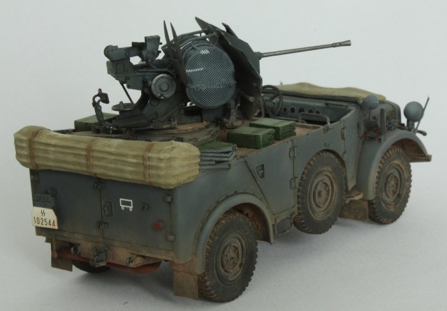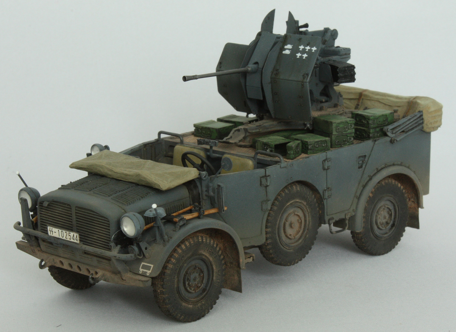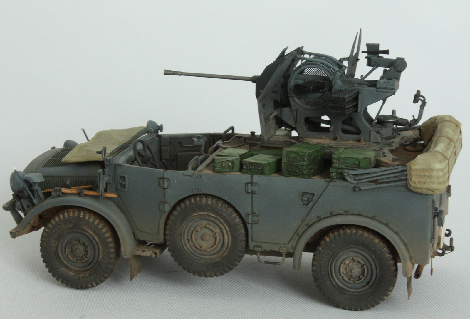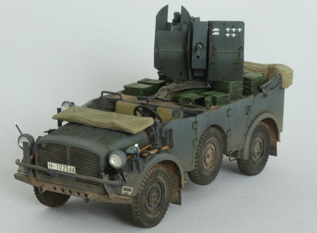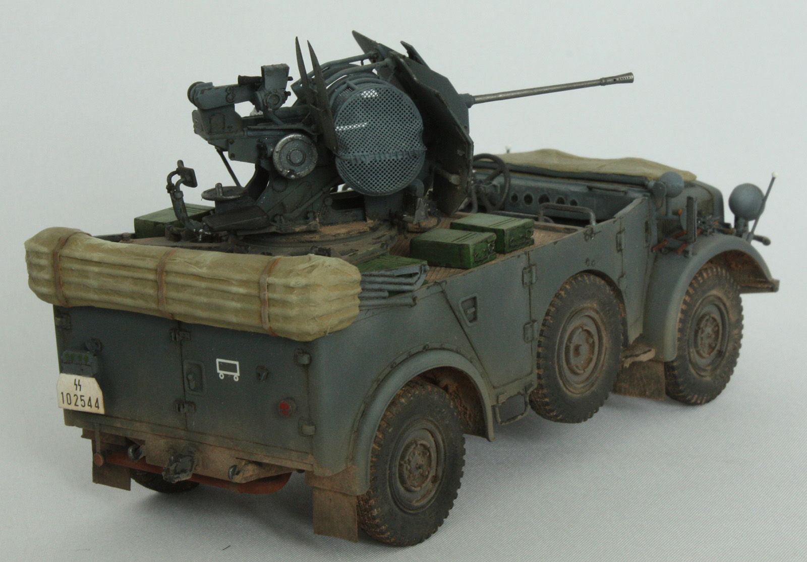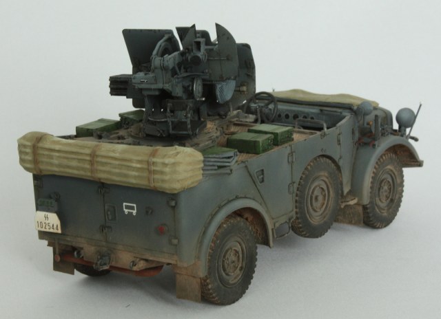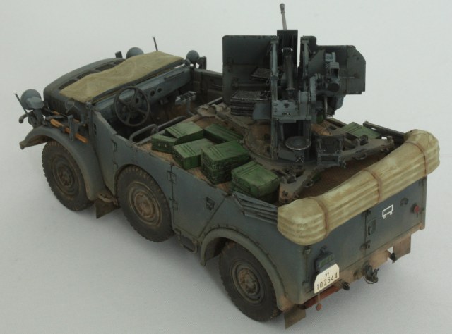 В моём случае носителем вооружения является военный автомобиль повышенной проходимости общего назначения HorchTyp 1a, в котором по задумке автора организована импровизированная платформа для монтажа орудия 2cmFlak 38.