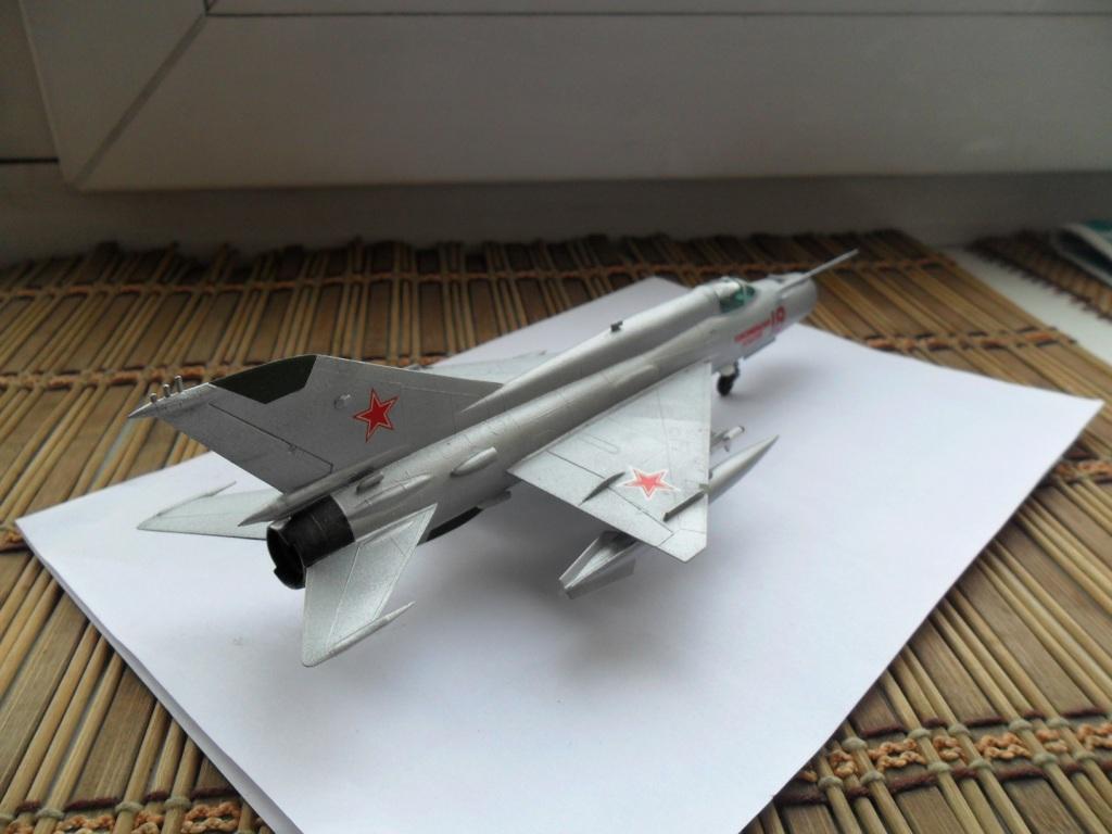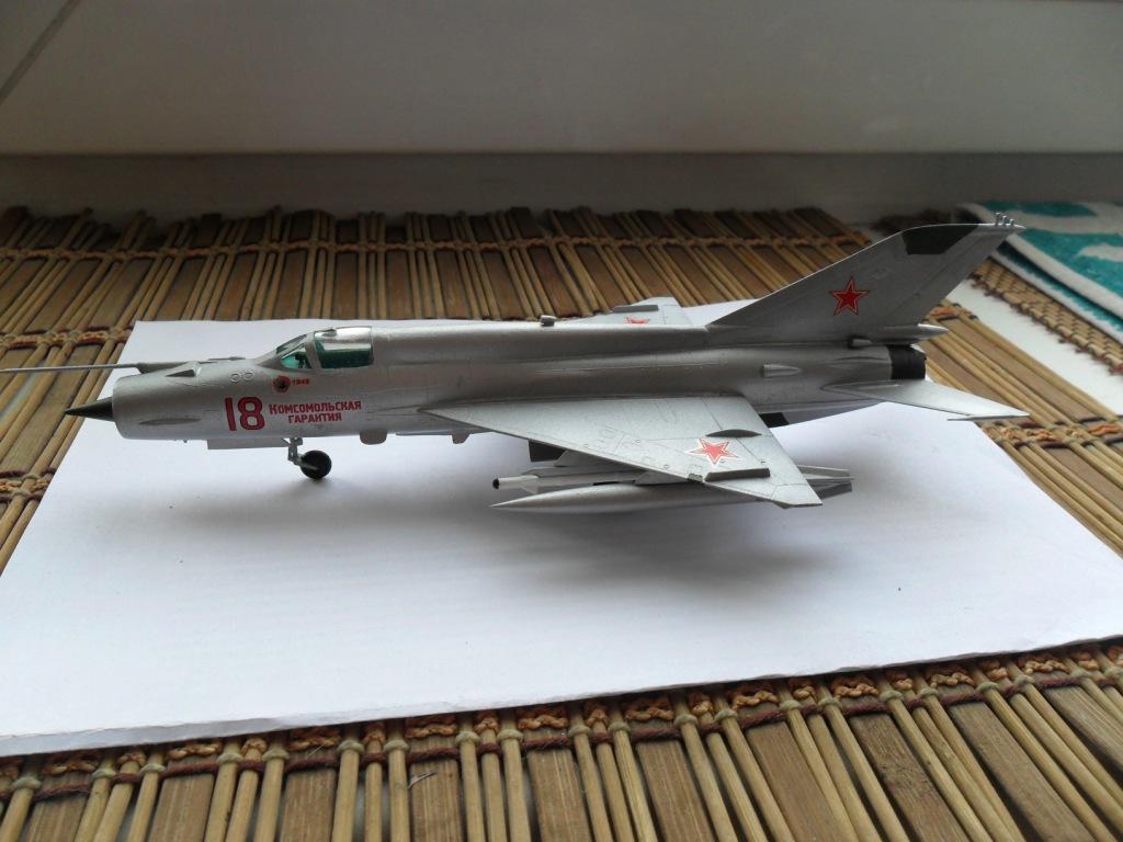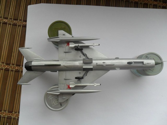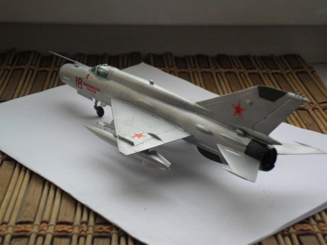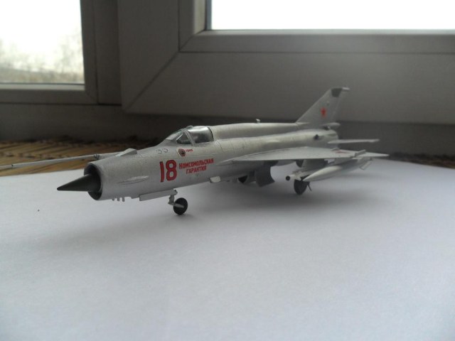 Здравствуйте! Модель МиГ-21СМ собрана из хорошо известного набора МиГ-21МФ от КР. Детали в наборе были с дефектами: недоливы, смещения и облой, некоторые детали были в виде бесформенных куском пластика. В наборе предлагалось собрать 1 из 2 вариантов самолёта ВВС Вьетнама, но мне хотелось именно собрать именно Советский самолёт, по этому были куплены декали фирмы "Бегемот". Были сделаны доработки: ПВД из иголок от шприца, антенны "свой-чужой" из тянутого литника, створки шасси из пластика от доширака, подвесные баки, ракеты и стойки шасси взяты из набора фирмы "Звезда", также рассверлены стволы пушек и сопла ракет. Модель загрунтована с баллона Tamiya, и окрашена аэрографом, красками Mr. Hobby, Звезда и АКАН. Конечно модель имеет косяки, после сборки я обнаружил пыль внутри фонаря. Прошу сильно не критиковать)