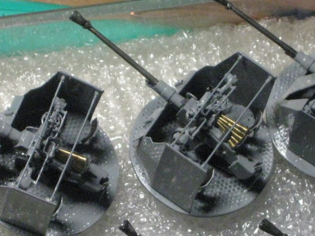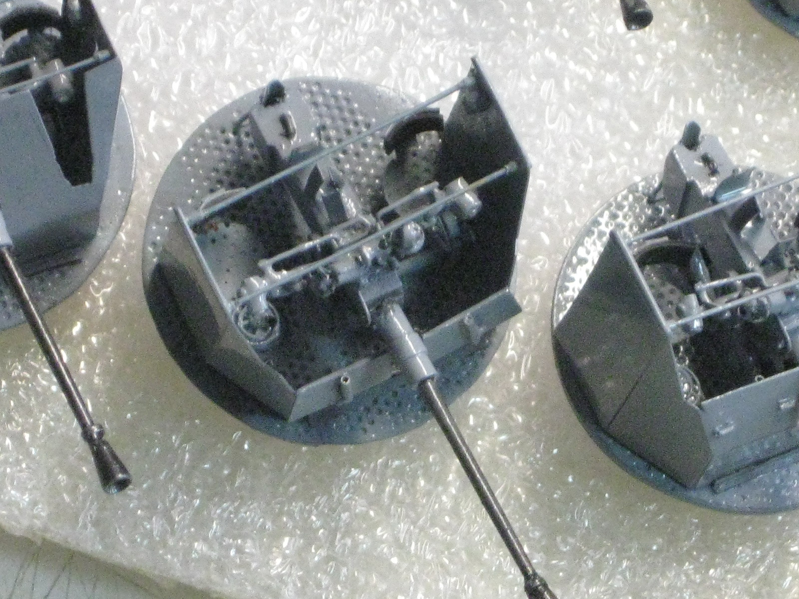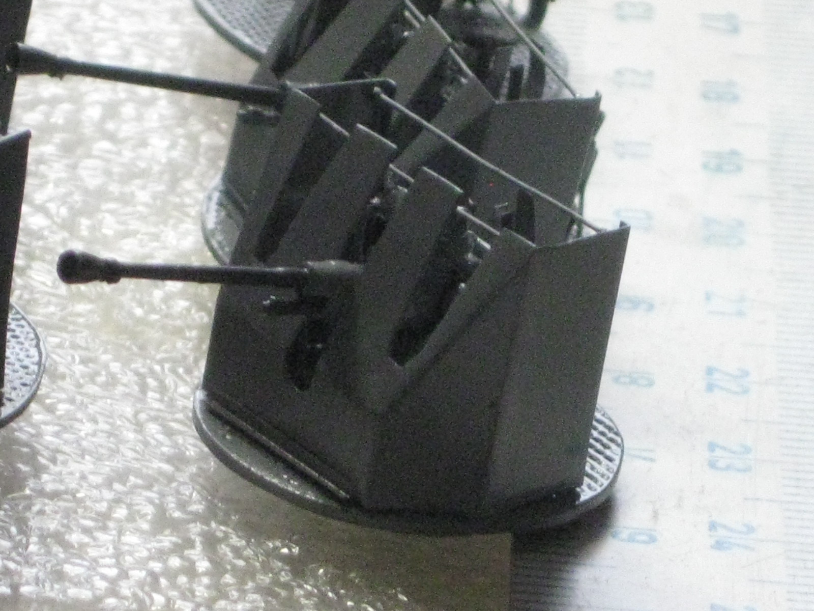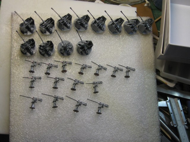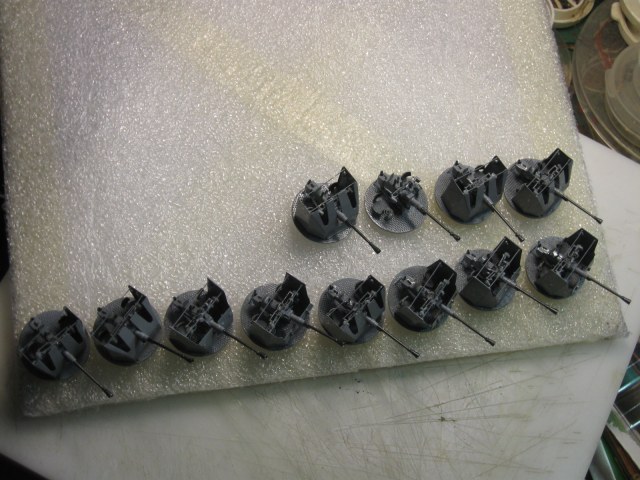 Давненько я завяз на них,привычка на очередную модель сначала сделать то,что сложнее.Вот я и сваял сначала сорокапятки,а потом 37-мм зенитки.А опять же по привычке замахнулся широко и произвел аж 12 штук. Ну начинаешь делать и на всякий пожарный делаешь несколько заготовок.Вдруг испортишь в процессе,потеряешь,сломают окружающие....Вот двенадцать площадок спаял,так и пошло....Ну ладно,соловья баснями не кормят,щас покажу. Масштаб 1/100.Материалы....уууу,самые разные: стальные сетки от телеэкрана,медная фольга,полистирол,токарка стволы-латунь и многое другое.