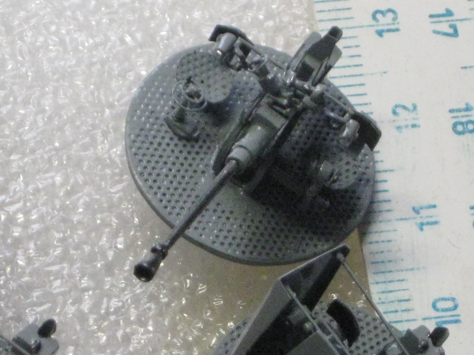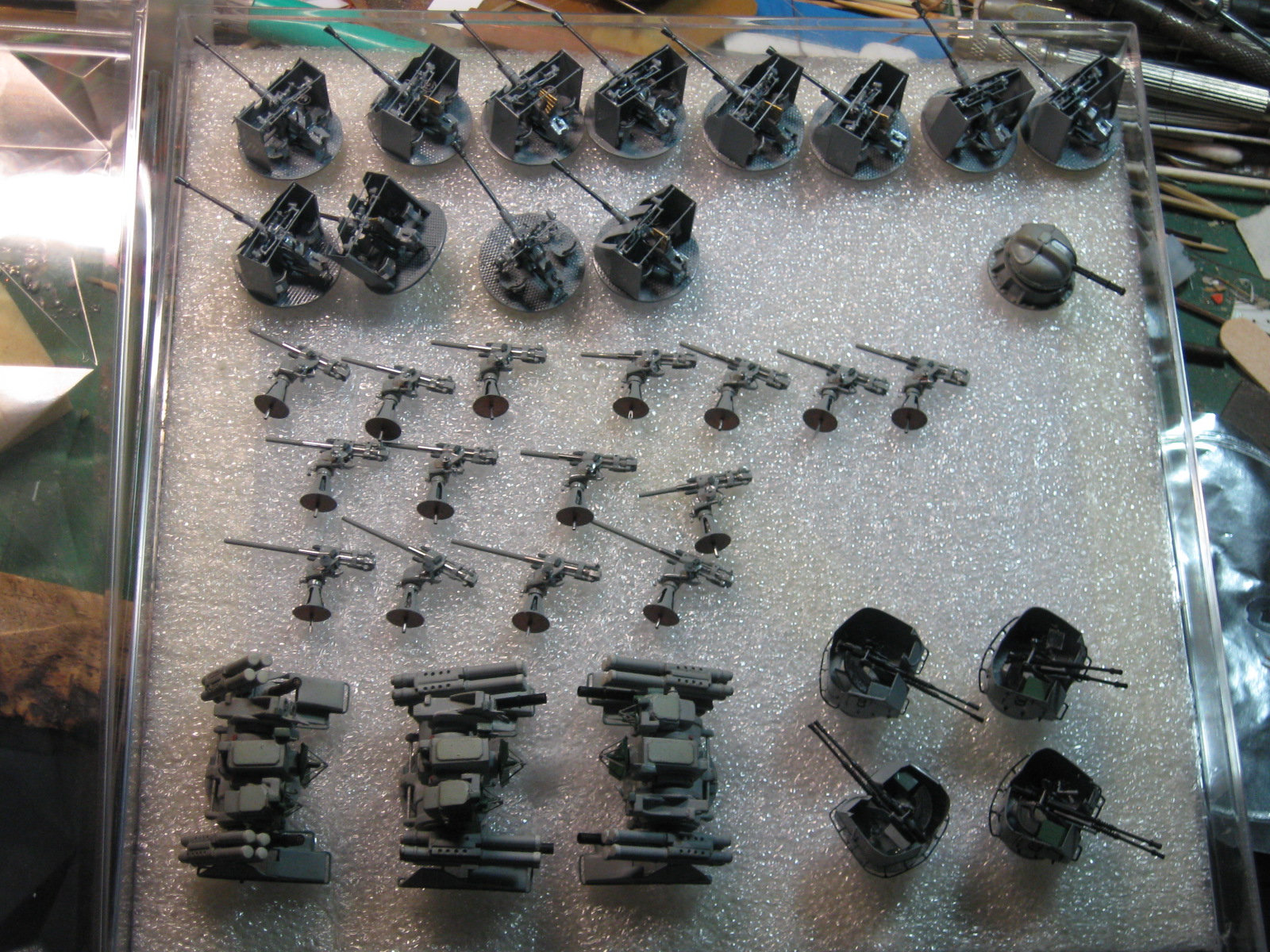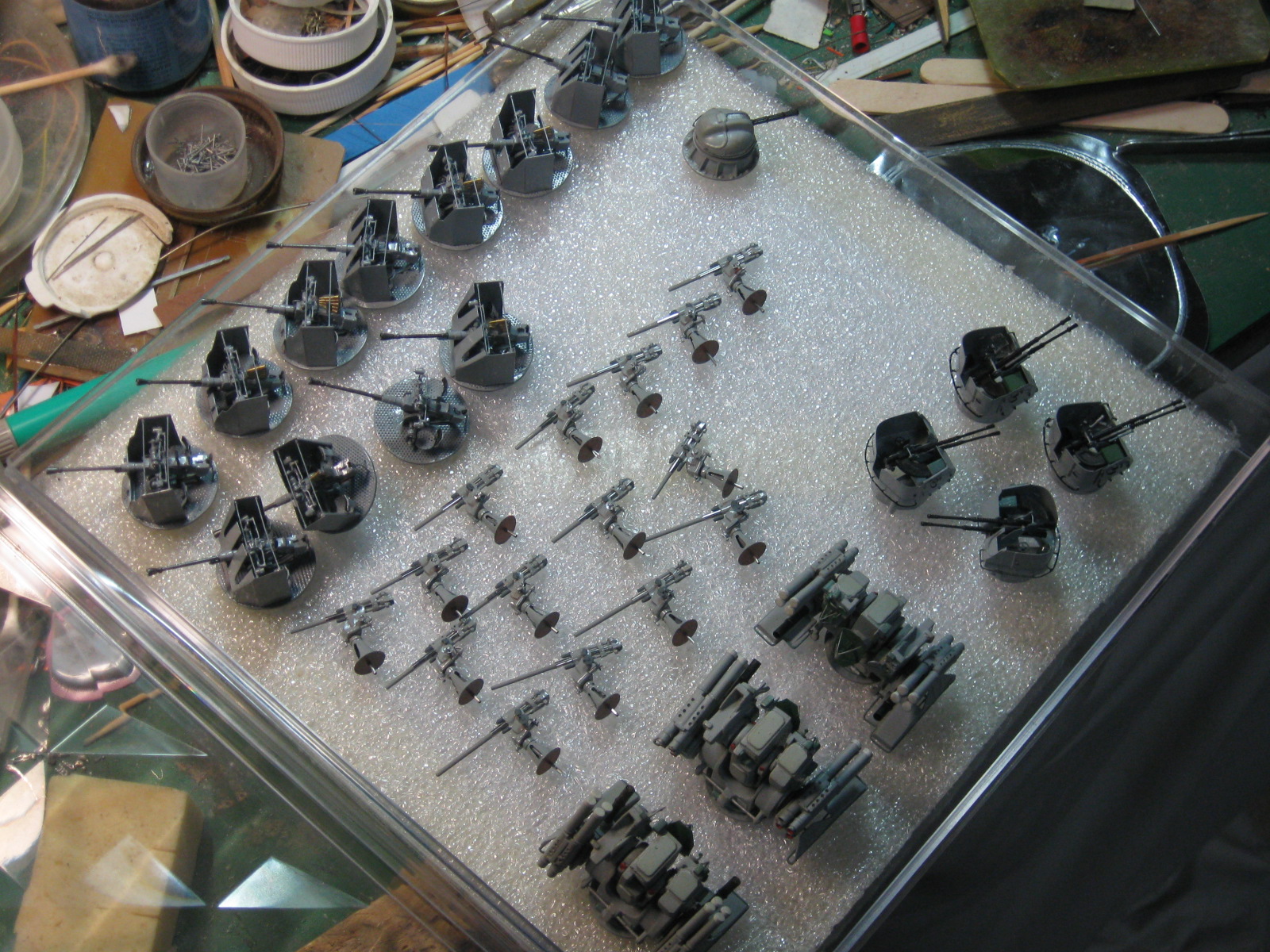 Давненько я завяз на них,привычка на очередную модель сначала сделать то,что сложнее.Вот я и сваял сначала сорокапятки,а потом 37-мм зенитки.А опять же по привычке замахнулся широко и произвел аж 12 штук. Ну начинаешь делать и на всякий пожарный делаешь несколько заготовок.Вдруг испортишь в процессе,потеряешь,сломают окружающие....Вот двенадцать площадок спаял,так и пошло....Ну ладно,соловья баснями не кормят,щас покажу. Масштаб 1/100.Материалы....уууу,самые разные: стальные сетки от телеэкрана,медная фольга,полистирол,токарка стволы-латунь и многое другое.
