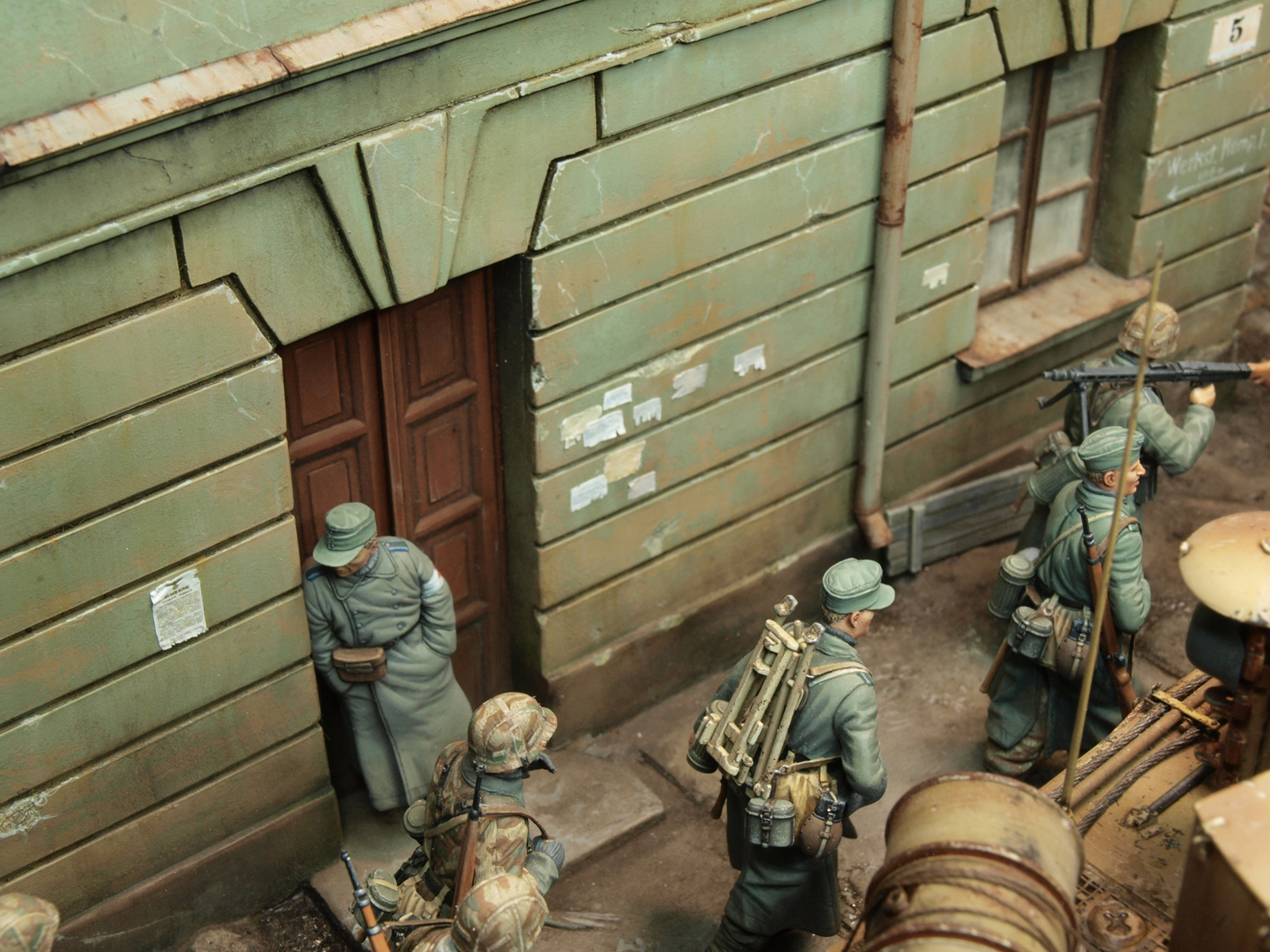 Отличная работа! Два дня разглядывал. На фоне многочисленных абы-как собранных, покрашенных и скомпонованных композиций не часто встречается такая проработка деталей, внимание к мелочам, и взаимосвязанность всех элементов. Всё здорово: и танк, и фигуры, и строение, и всё вообще))) Спасибо за доставленное удовольствие!