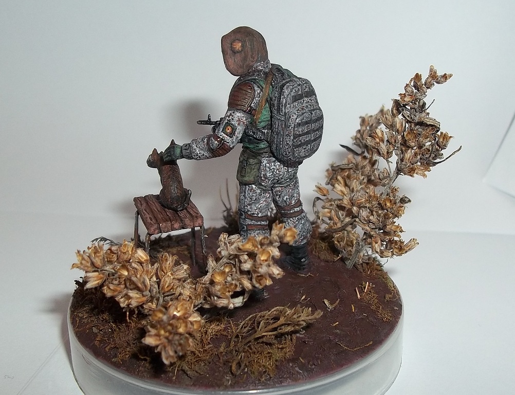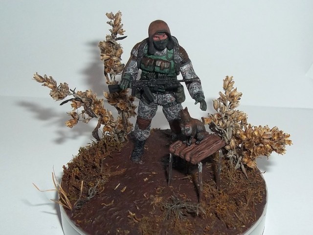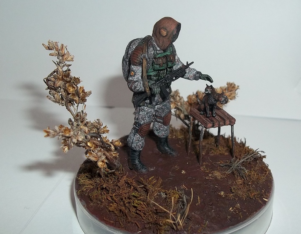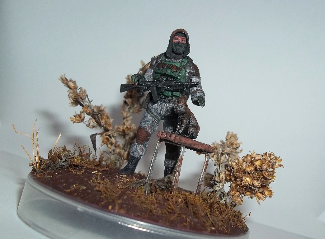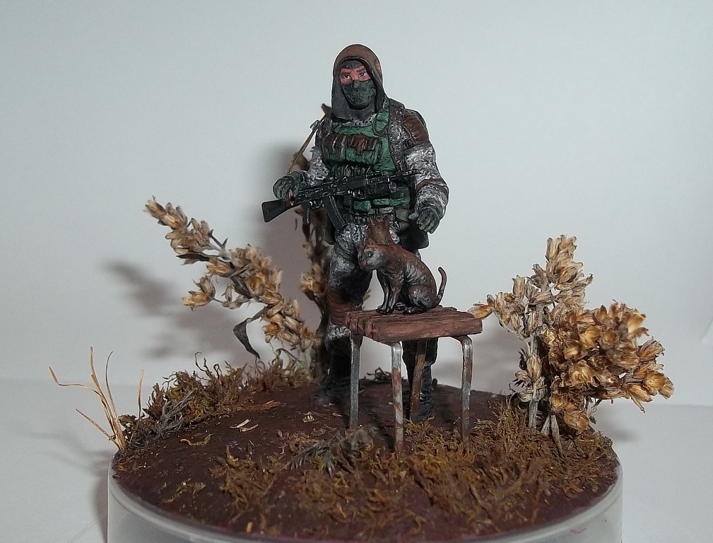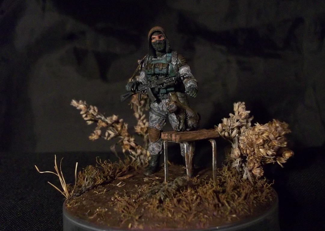 Алоха! Решил плавно перейти на 35-й масштаб, потому для первого "блина" никаких замысловатых поз и минимум лишних деталей. Лепил из глины на проволочный каркас. В процессе работы над поделкой убедился, что глина явно не подходит для такого масштаба, посему одолжил у "Звезды", кроме автомата и котёнка, ещё и подсумки, кисти рук и берцы. Табурет из спичек на скрепках, для антуражу закидал подставку сушёным мохом и другими травами.