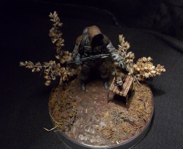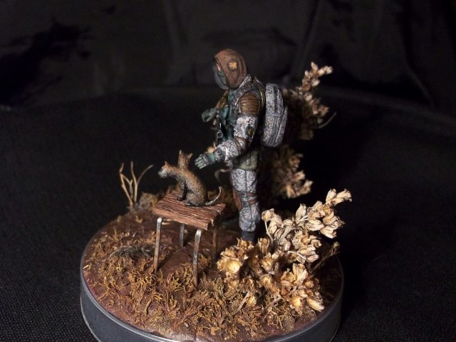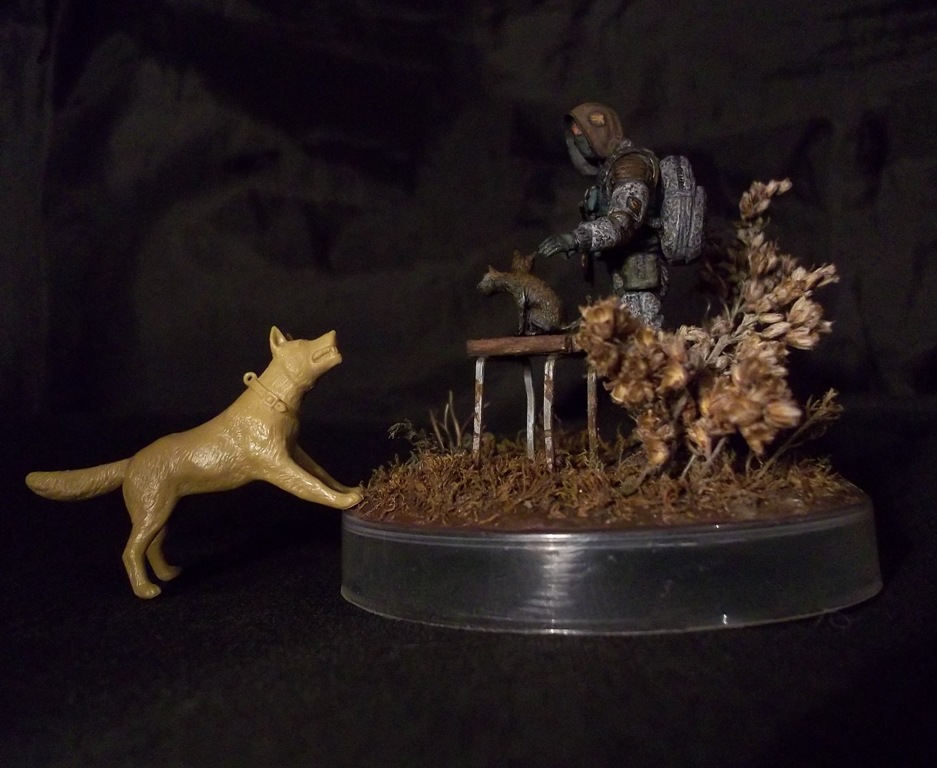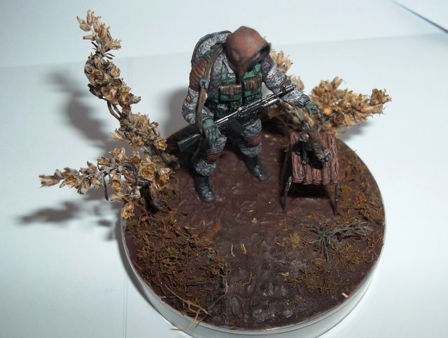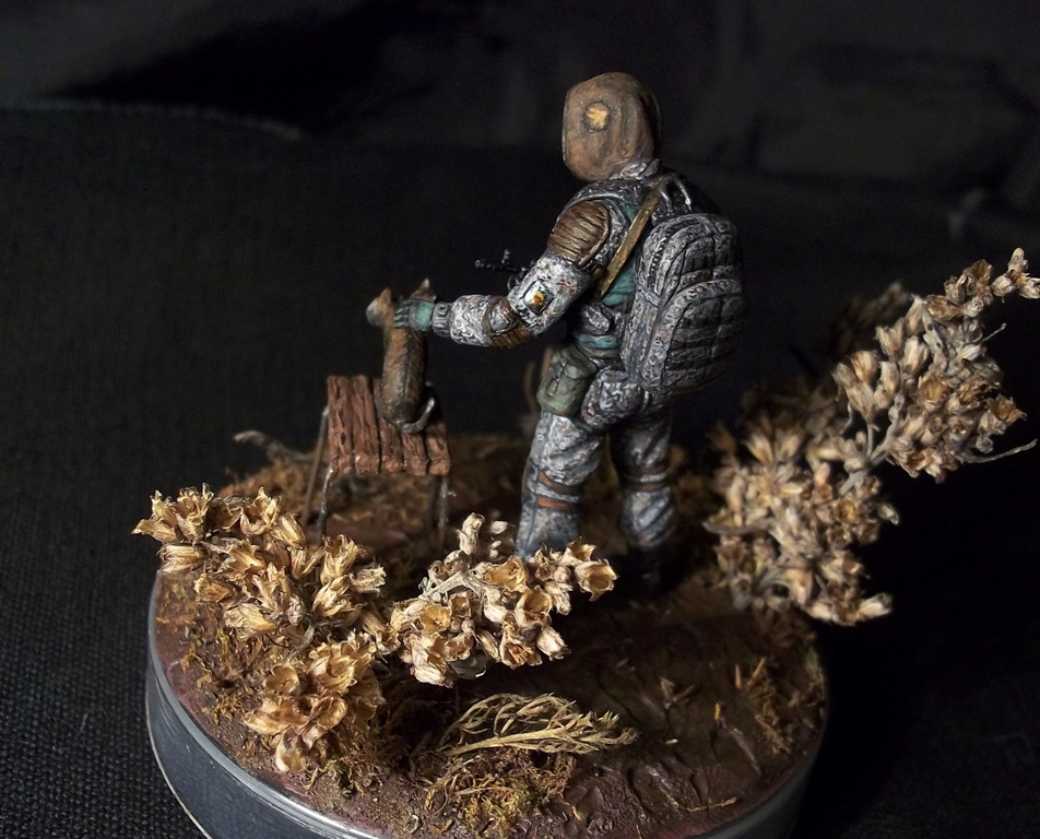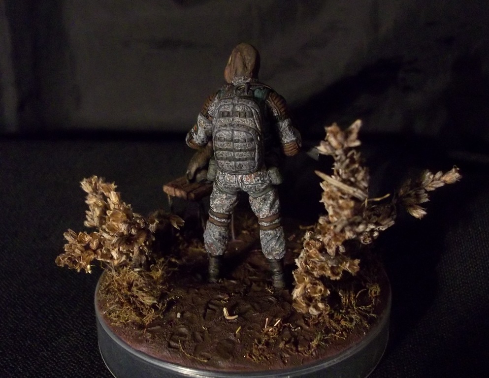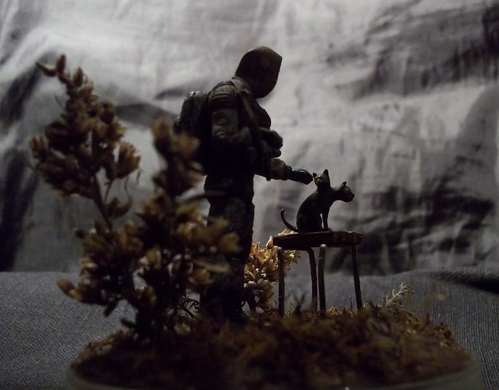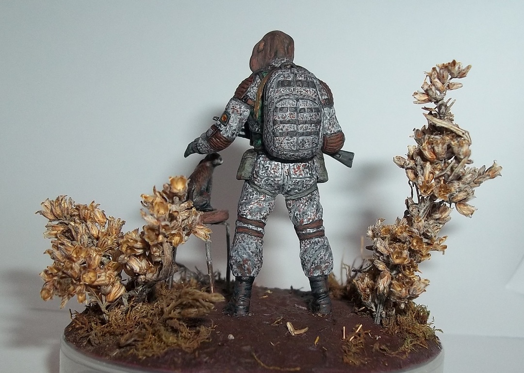 Алоха! Решил плавно перейти на 35-й масштаб, потому для первого "блина" никаких замысловатых поз и минимум лишних деталей. Лепил из глины на проволочный каркас. В процессе работы над поделкой убедился, что глина явно не подходит для такого масштаба, посему одолжил у "Звезды", кроме автомата и котёнка, ещё и подсумки, кисти рук и берцы. Табурет из спичек на скрепках, для антуражу закидал подставку сушёным мохом и другими травами.