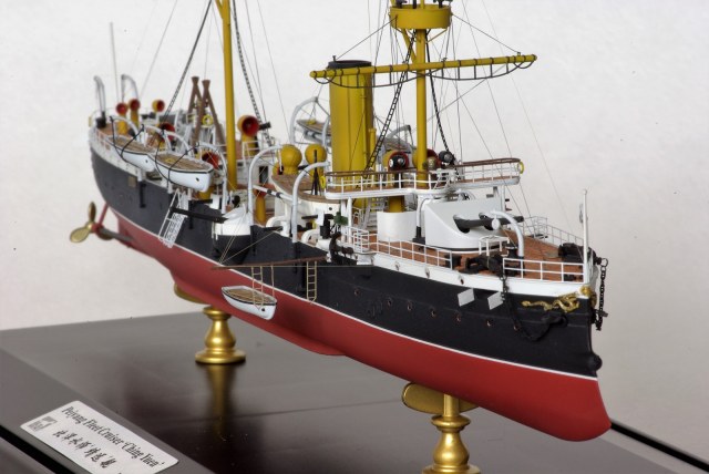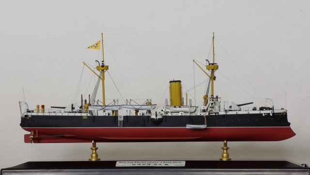 Долго исторической справкой по этому кораблю вас нагружать не буду. Вкратце отмечу что серия из двух крейсеров этого типа строились в Великобритании на эльсвикских верфях фирмы Армстронг для военно-морских сил Китая. Заложен крейсер был 20 октября 1885 г.. Спущен на воду 14 декабря 1886. Введен в строй 9 июля 1887 г. Считался одним из лучших крейсеров императорского флота Китая и, по существу, крейсера этого типа были единственными китайскими кораблями, способными на полноценные крейсерские операции. Принял активное участие в первой японо-китайской войне, участвовал в известной битве при Ялу.