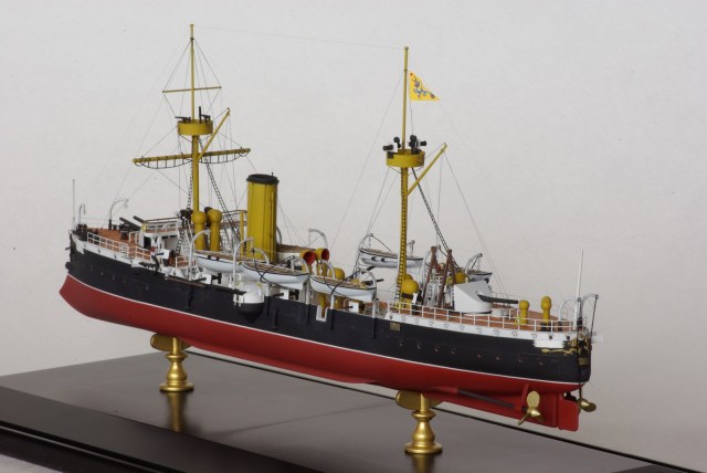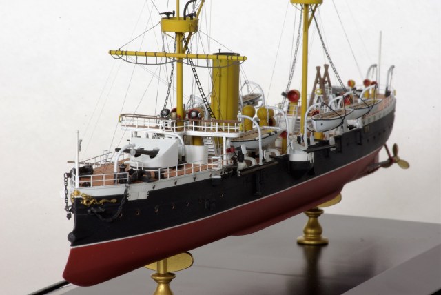 На корме, это тоже "найтовые" (сорлинь на сколько я знаю, на этом крейсере не предусмотрена по проекту, как и запасной аварийный руль) которые свисают с кран балок в "воду" так как кормовой "тузик" у меня по задумке спущен на воду и пришвартован у шлюпочного "выстрела". Эти "найтовые" вдеты в рымы которые закреплены под головами драконов, их возможно плохо видно на фото (из за их размера) но они есть. Такая идея со свисающими концами в воду была подсмотрена тоже на фото прототипа. Возможно само исполнение конечно не самое идеальное, наверняка можно было сделать как-то более приглядно ((