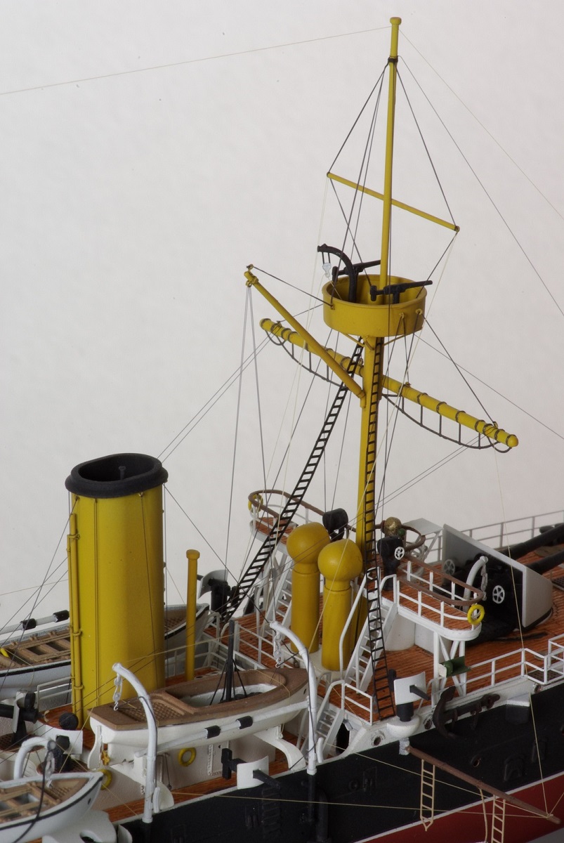 Если вы про светлую нить от носа через две мачты до кормы, то это не грота и фок-штаг, это мое исполнение флаг фалов для сигнальных флагов. Была задумка как на некоторых фото (на стоянке) украсить крейсер сигнальными флагами! Но поскольку не смог найти такого декального набора, эта затея не воплотилась ((
