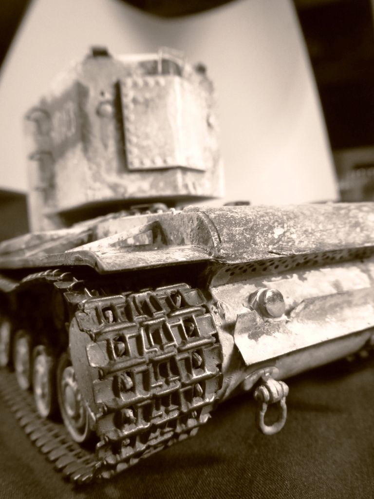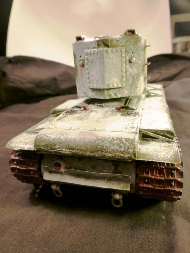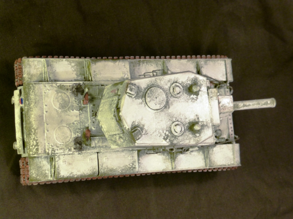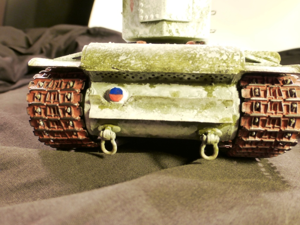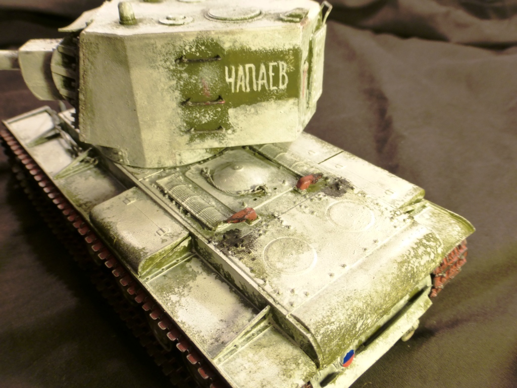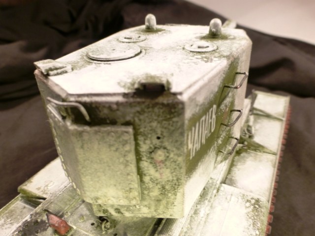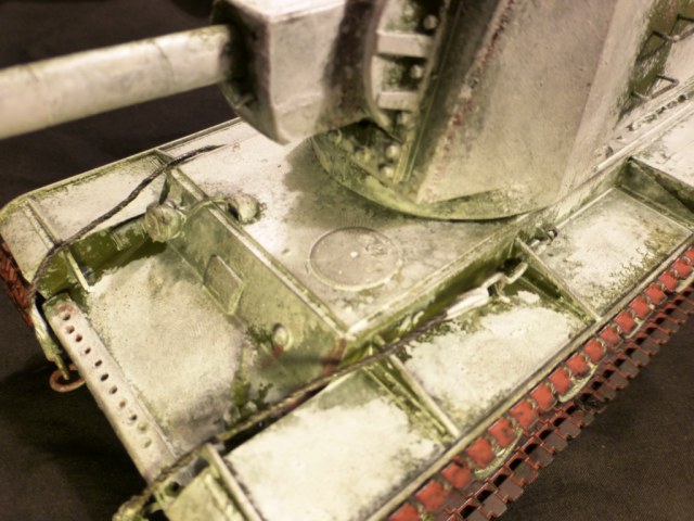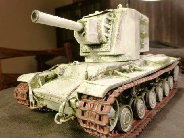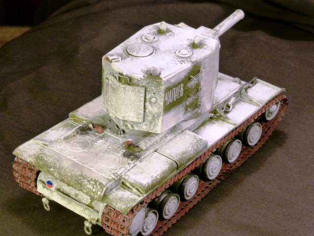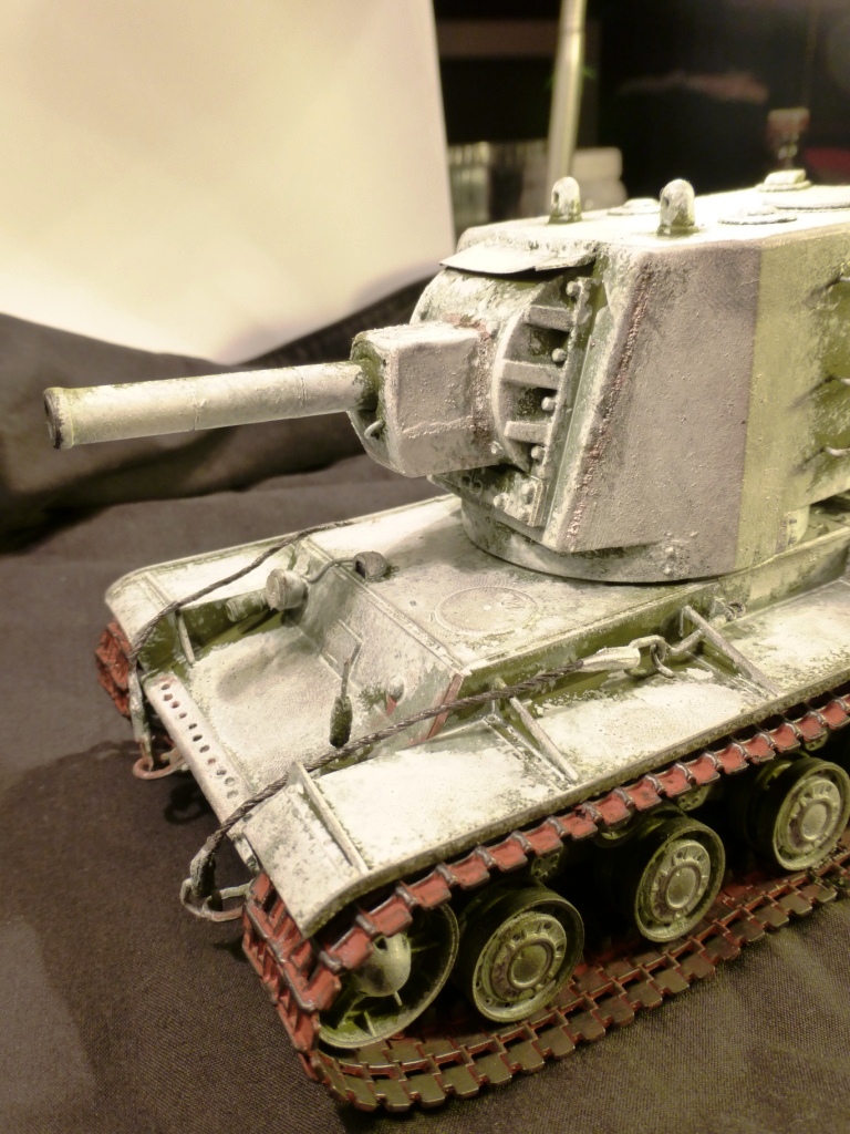 Доброго времени суток! КВ-2 ранней версии от Арк-Моделса) Доработки: 1)Поручни, 2)Трос и крюки для крепежа, 3)Приборы наблюдения, 4)Козырёк надо казенной частью из жести, 5)Рассверлены выхлопные патрубки, 6)Сзади добавлен катафот и планка из жести, 7)Прибор наблюдения мех.вода, 8)Сварные швы, 9)Гусеницы из набора Трампетера винил, 10) Антенна и антеный ввод, 11) Фара, сигнал и проводка к ним. Вроде бы и всё.