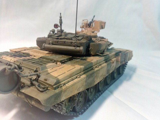Не понравились щели между ВЛД и НЛД, на стыке передних брызговиков и борт. экранов, не увидел спаренный ПКТ, погодный датчик кривовато приклеен, антенна толстовата, ОЗ почему то только на левом ЗИПе, в "красных глазках" нет черной точки (см. на фото реального танка). Окраска в целом хороша.