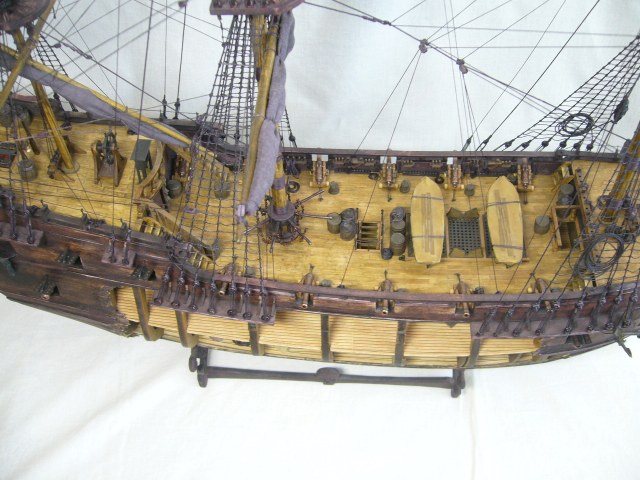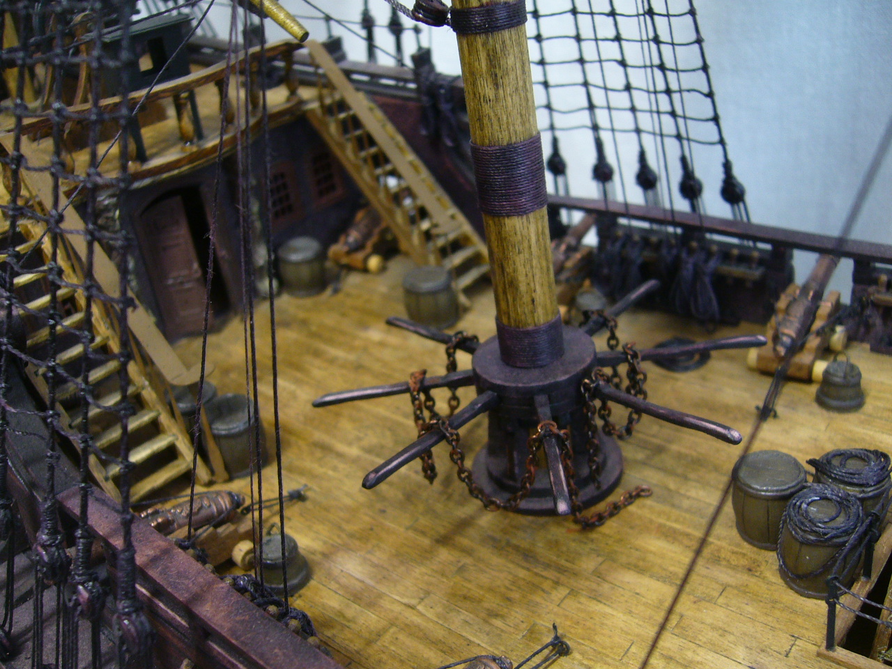 Из явных бросающихся в глаза недоделок - паруса, не имеющие хоть какой-либо имитации сшивок полотнищ...., а их (сшивки полотнищ), в таком масштабе должно очень хорошо быть видно даже на собранных парусах.... ликтросы тоже значительно оживили бы вид парусов..... также портит вид отсутствие вообще тросов, крепящих верхнюю шкаторину всех парусов к реям (нету ни слаблиней, ни ревант...)...., ещё очень упрощены как сами реи, так и их хилое и не убедительно изображённое крепление к мачтам....., ванты не натянуты, кое-где видно, что они провисают волной...., хотя выполнены вполне красиво и масштабно..... по штур-тросу (его непонятной проводке) серьёзный вопрос, почему вместо того, чтобы уходить вниз прямо через решётку под барабаном штурвала, концы штур-троса разведены в стороны и упираются в палубу?.... и сама решётка, разве должна просто в воздухе так висеть? какой тогда в ней полезный смысл...., наверное скорее всего она должна лючёк, для штур-троса предназначенный закрывать....? Ещё ощутимо "напрягает" фанерный "потолок" внутренних помещений, при такой подробной и красивой деталировке всего остального внутреннего убранства и скраба.... также бросается в глаза сильная не масштабность палубной обшивки внутренних палуб, особенно в сравнении с обшивкой бортов и верхней палубы..... про имитацию нагелевания, т.е. её отсутствие, даже уже и не буду придираться, хотя в 48-м масштабе она тут явно напрашивается.....