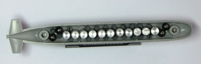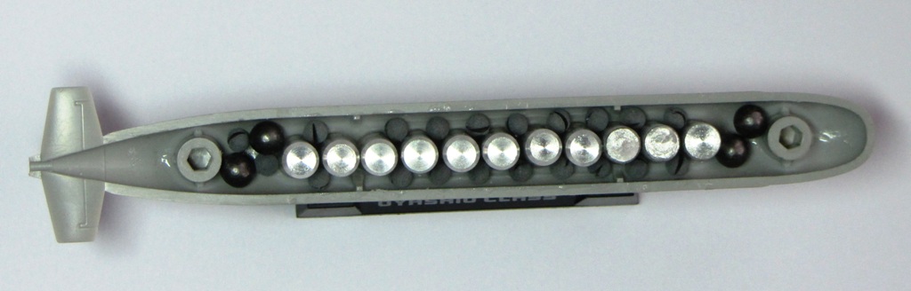 На этом принципе и основано погружение моей модели. Предварительно я выточил из алюминиевого прутка 11 гильз-балластов, открытых с одного конца аналогично стаканчику, описанному выше. В днище модели по килевой линии я сделал соответственно11 отверстий и вклеил туда гильзы открытой часть наружу, т.е. «вниз» при нормальном положении модели подводной лодки. Высота гильз взята максимальной, чтобы они полностью поместились в корпусе модели. На днище вдоль киля лодки вокруг гильз вклеены свинцовые грузила расчетной массы. Все размеры, массы и количество выбраны отчасти расчетным, а также эмпирическим путем, на что ушла куча времени и сил. С учетом размера модели, дело это оказалось очень тонким и чувствительным: даже одна десятая грамма имела значение! В ходе ходовых испытаний пришлось добавить балласт в виде двух грузил на киле. Гильзы я старался сделать минимально необходимого диаметра, чтобы, с одной стороны, лодка хоть немного могла плавать на поверхности воды, а с другой стороны, чтобы модель внешне не слишком отличалась от прототипа. Конечно, отличие в области киля все равно есть, понятно, но это не режет глаз. Строго говоря, такую модель следует называть «докилевой» или «по киль» по аналогии с известными моделями «по ватер-линию». Ну а теперь, собственно, о погружении. Как видно на видео, модель чудесно погружается и держит заданную глубину. Отрыв от поверхности происходит примерно при 0.5 бар, а нулевая плавучесть на глубине достигается при около 0.3 бар. Такая разница объясняется действием сил поверхностного натяжения воды, которые удерживают модель на поверхности. Ощущения просто потрясающие! Можно, конечно, использовать воздушный компрессор, но резиновая груша намного лучше в смысле ощущений: такое впечатление, что ты сидишь в субмарине и управляешь ею, настолько реалистичное ощущение. Это именно то, что отличает восприятие управления лодкой от, скажем, радиоуправления. Там ты как-то отдален от объекта, а здесь кожей и мышцами чувствуешь непосредственное свое влияние на лодку.