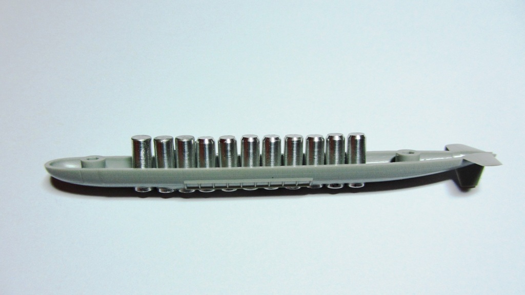 Ну конечно же ничего не шло в наборе!!! В наборе был обычный набор литников и больше ничего конечно. Все остальное - моя идея и исполнение. И не с чего было копировать ли брать пример, как это обычно происходит при просто раскрашивании. И самое трудное было придумать диаметр и высоту этих гильз-цистерн. Если мало, то не будет погружаться, если много, то на модель не будет похоже, а действительно макет получится. Вот и исследовал, точил, перетачивал, перекрашивал. Две модели загубил (выше на фотке), третью вот представил. Поэтому на окраску уже не было настроения, мне это казалось несущественным