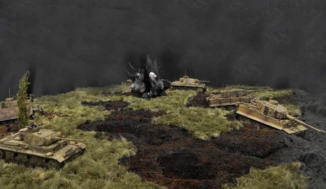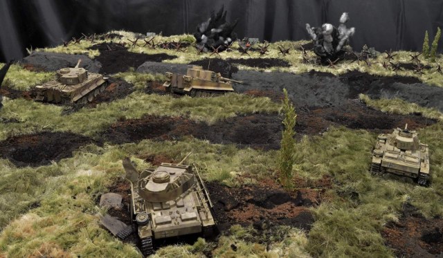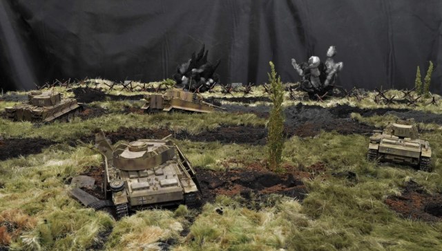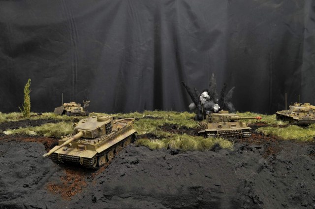 Взрывы... Это для меня один из сложных элементов в изготовлении. К сожалению, разрывов бронебойных не удалось воспроизвести, так что больше похоже на фугас, которыми лупят артиллерия, самоходы и авиация, в частности Юнкерсы, которые пробивали проходы в противотанковых рвах.