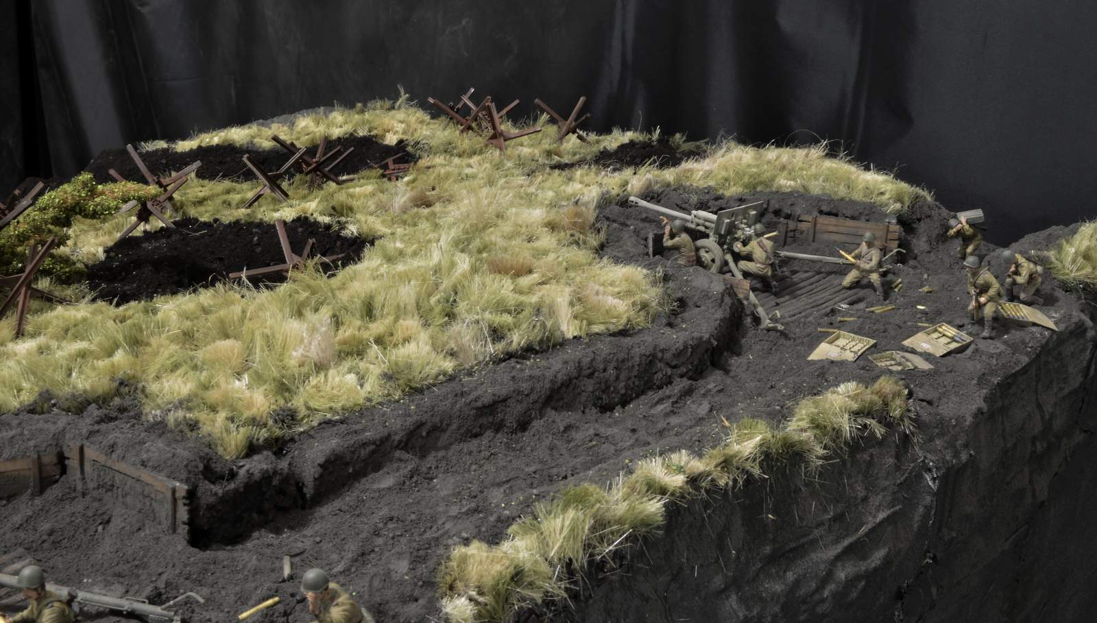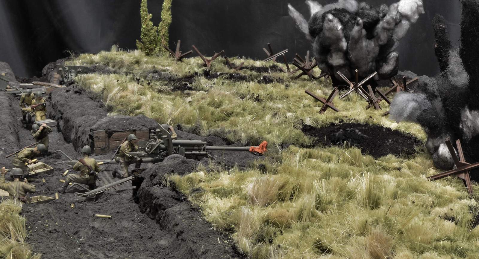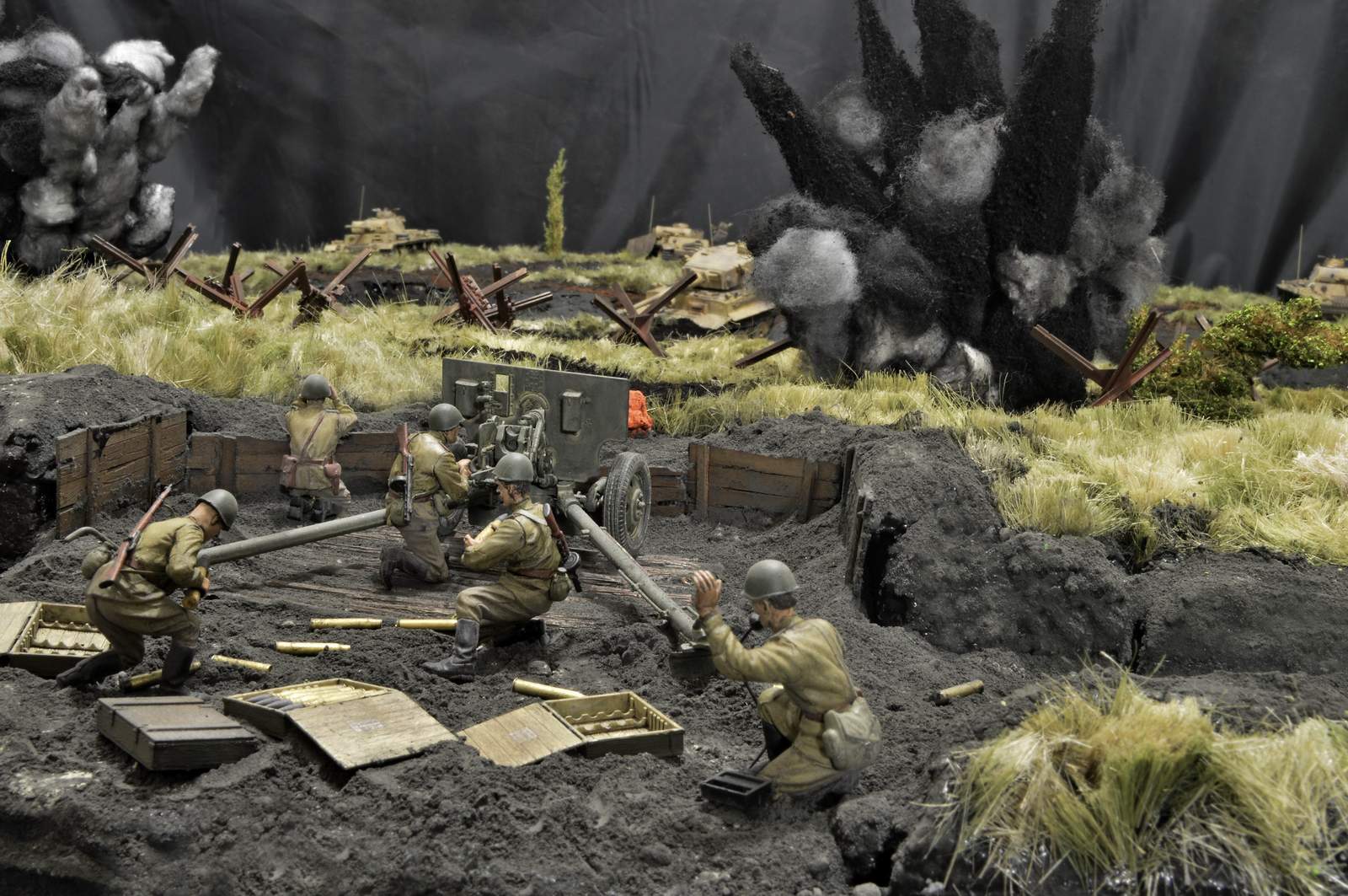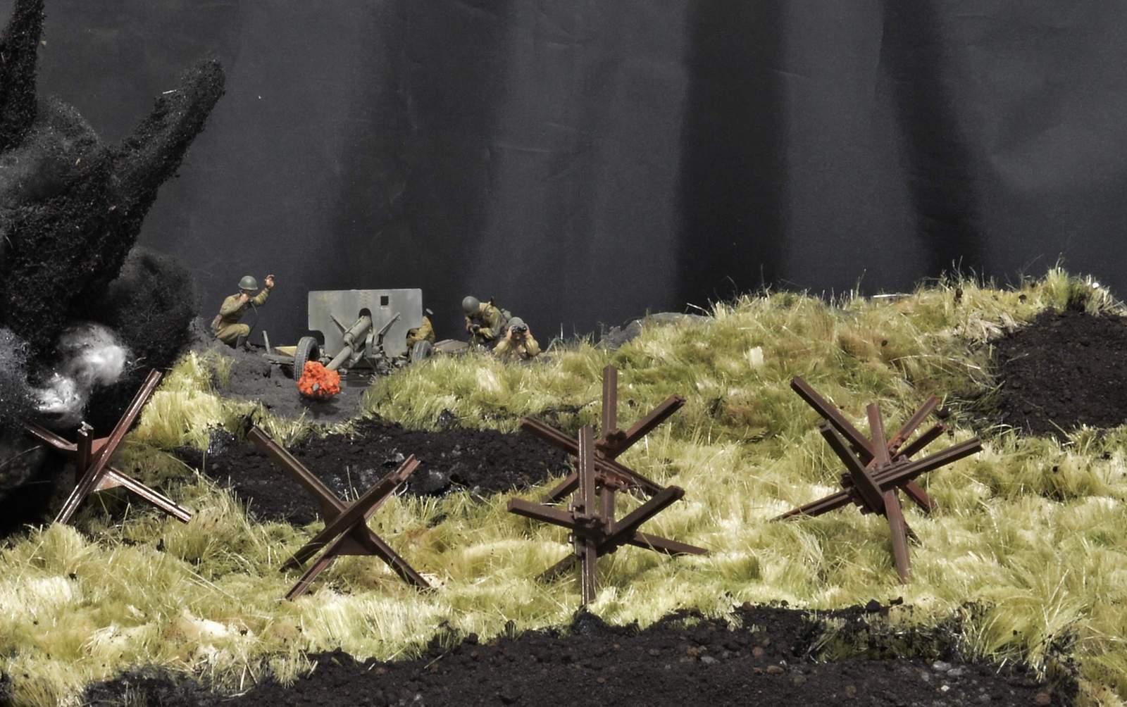 Я ждал, что будут именно такие комментарии, и соглашусь с вами, коллеги. Действительно и наши, и немцы действуют во взаимодействии с пехотой. Так есть, и так мы привыкли видеть и в документальных, и в художественных фильмах… НО! Композицию я делал непросто по придуманному сюжету. Я сначала внимательно несколько раз пересмотрел историко-документальный фильм «Огненная Дуга», а точнее свой сюжет. Первым ударом шли танки прорыва, следующая армада уже из танков и пехоты следом. Их, к сожалению, на этой диораме нет… Далее их встречали противотанковые батареи в основном укомплектованные орудиями ЗИС-3. Окопы с пехотой – это всё позади, их на диораме тоже нет…