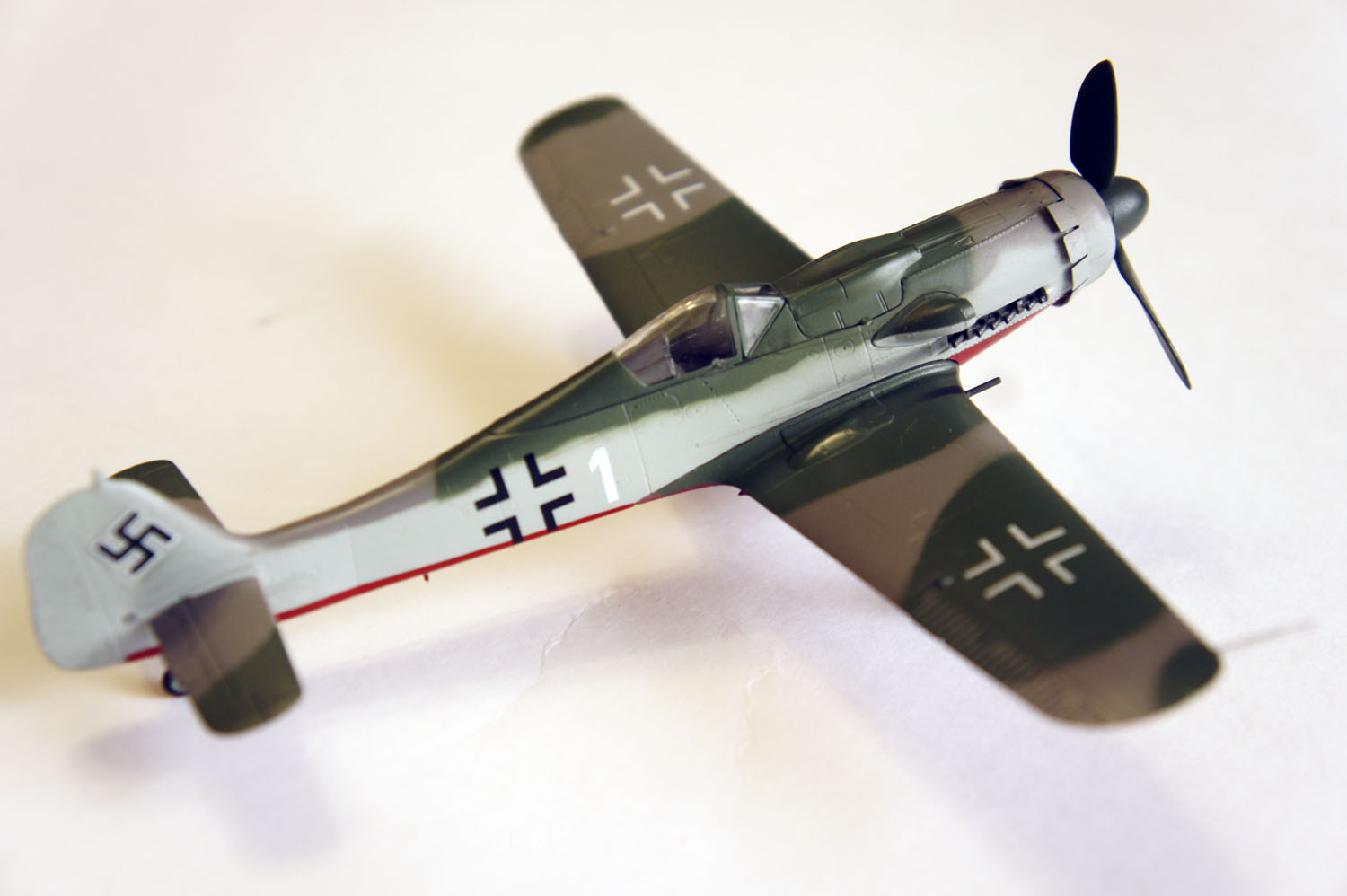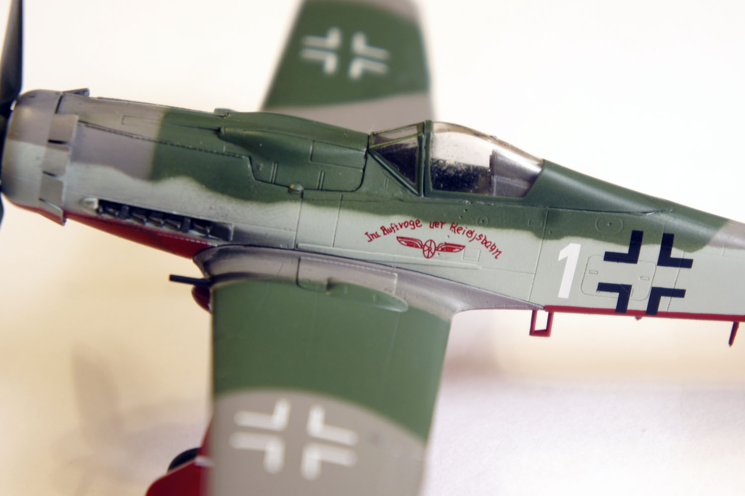 Начиная от полос внизу (на каждой консоли по 8, у вас 7, и на фюзеляже они сходятся у задней стойки, у вас под кабиной), крестами (д.б. просто чёрные), на борту черный с белой обводкой, свастика без обводки, 1 - крсная с белой обводкой, девиз по другому, ч/б шахматка, носовая часть кока жёлтая, и заканчивая неверным полями камуфляжа и странным серым цветом.