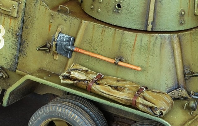 - на этот раз замениз колеса на Миниартовские,фары Эльф,пулемет от какой-то модели,скатка из бумаги,трос из проволки.Под радиатором переделал поддон.