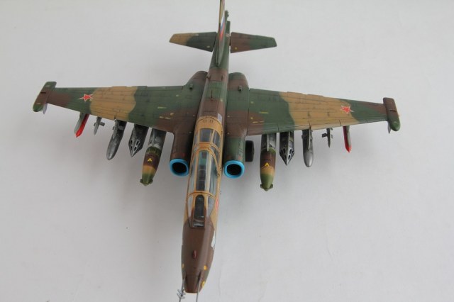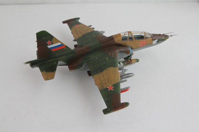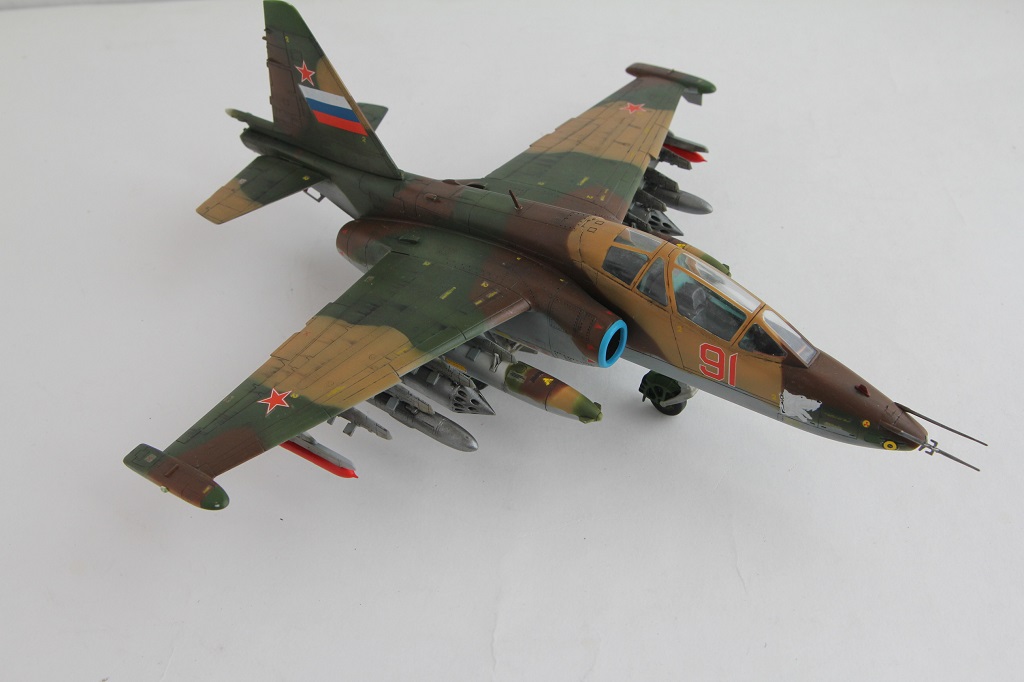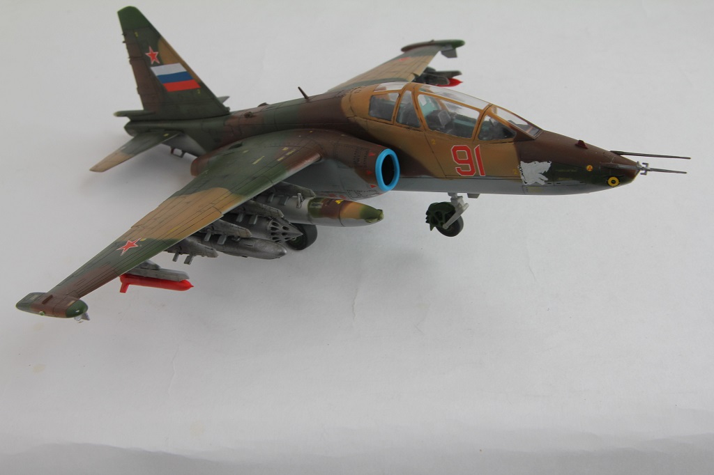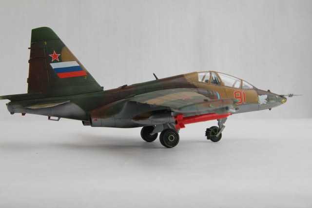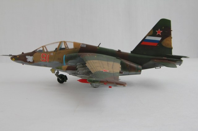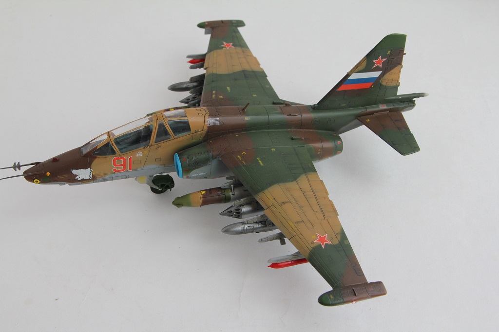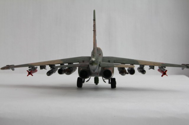 Лично меня смущают некоторые недоработки и неточности. Пожалуй самые "поношенные" из всего парка ВВС - это Су-25, а уж тем более машина периода конца 90-х - начала 2000-х (судя по ОЗ). Допустим, самолет только с ремзавода, тогда головы псов должны быть красными с белой окантовкой. Никогда не видел такого цвета низ фюзеляжа на сушках. Было бы неплохо прокрасить переплет фонаря изнутри кабины. Ну и где фото снизу?