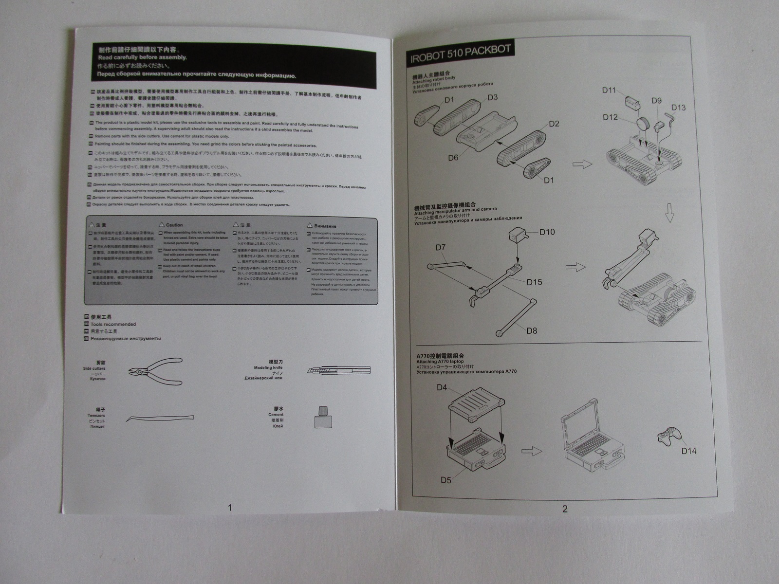 Итак, перед нами коробка размерам 165х260х37 мм, из достаточно плотного картона с красочным бокс артом на лицевой стороне. На бокс арте изображены два сапёра в костюмах EOD 9, СВУ, два робота сапёра и блоки управления к ним. На обороте схема окраски роботов и фигур, также она схема сборки фигур, достаточно информативна. Инструкция по сборки роботов и блоков управления дана отдельно на плотной бумаге по размерам на треть меньше формата А4, но при этом также всё понятно. Внутри три литника серого цвета и один прозрачный, каждый упакован в отдельный пакетик. Облой крайне мал, его почти нет, шов есть (куда уж без него), но тоже еле заметен, всё устранимо, утяжин и недоливов нет. Качество литья как всегда у менга на высоте. Первый литник А/В с фигурками сапёров в костюмах EOD 9. Фигурка А изображает сапёра стоящим на месте. Фигурка В изображает сапёра сидящего на корточках обезвреживающего СВУ и само СВУ из двух, скорее всего фугасных 122-мм снарядов, оно несколько отличается от того что нарисовано на картинке, но это мелочь. На литнике С робот TheTalon (Коготь) и блок управления к нему. На литнике D робот TheIRobot 510 PackBot и управляющий компьютер Getac A770 к нему. Отмечю что детали роботов крайне малы и требуют повышенного внимания и аккуратности при сборке. На прозрачном литнике всего две детали – это прозрачные забрала к костюмам. Они действительно прозрачны, на последнем фото это видно. Слегка разочаровывает отсутствие декалей. Проволки для имитацией проводов тоже нет, но это поправимо. В целом данный набор оставил положительные впечатления. Всем рекомендую.