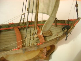 Вёсла: в наборе заготовки вёсел с надпилами. Стамеской весло дорабатывается до нужной кондиции. По надпилам делаются "выборки" для пущей красоты. Стилизация, так её растак. Весло кидается в кипяток минут на 10 и распарившись, чуть выгибается над паяльником (так же, как и реи). Опять же для некоей красоты и чтоб было всё в "плепорцию": киль так же имеет выгнутость (но он уже так и выпилен, не распаривается, слава те, Господи), стало быть всё у нас стремится своими линиями к "округлости" - лавки, вёсла, реи, руль. Всё "искажено". И в этом наблюдается какой-то шарм. Крацовочной щёткой бор-машинки делаем брашировку деталей из массива, тонировал масляной краской.