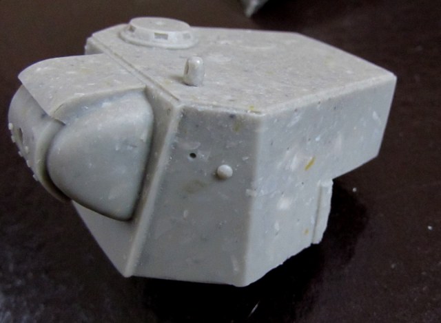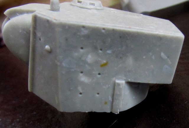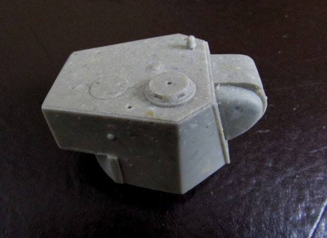 Башня - отдельная тема для разговора. Я к моменту покупки нашел на просторах Интернета два отзыва о данной модели. Первый, сделанный в конце 2014 года, показывал качественно отлитую башню из однородной смолы. Второй, сделанный гораздо позже, показывал башню, отлитую по принципу мебели из ДСП - контур + прессованные обрезки. Такое доводилось, конечно видеть - у МоделТранса, например - но там это было видно на месте среза, который все равно закроется гусеницей. Здесь же вся башня выглядит, как кусок гранита - по фактуре один в один зернышки-прожилки.