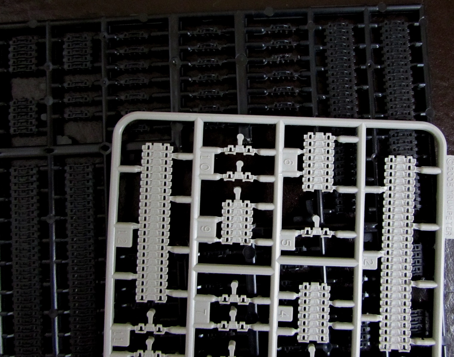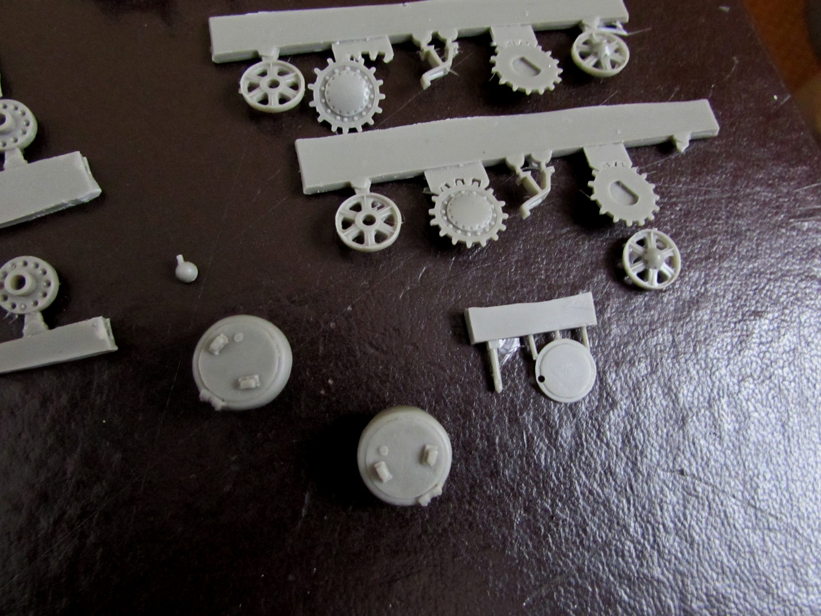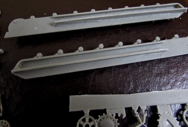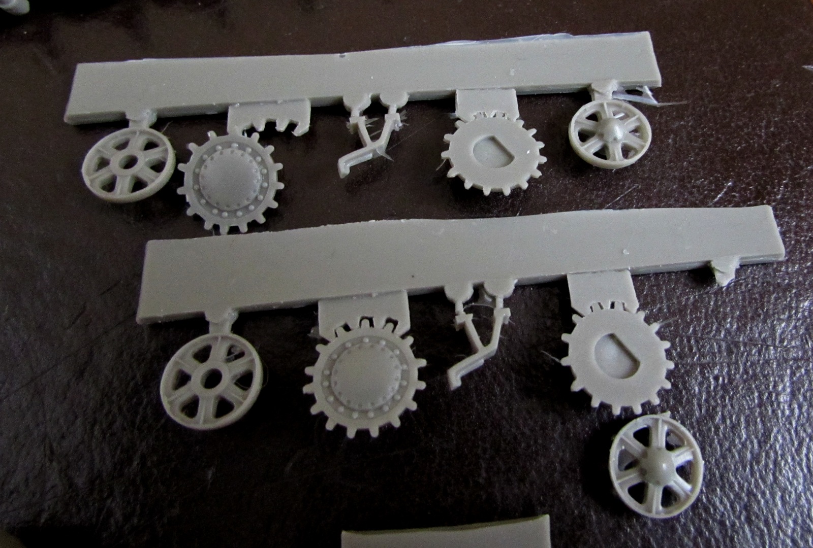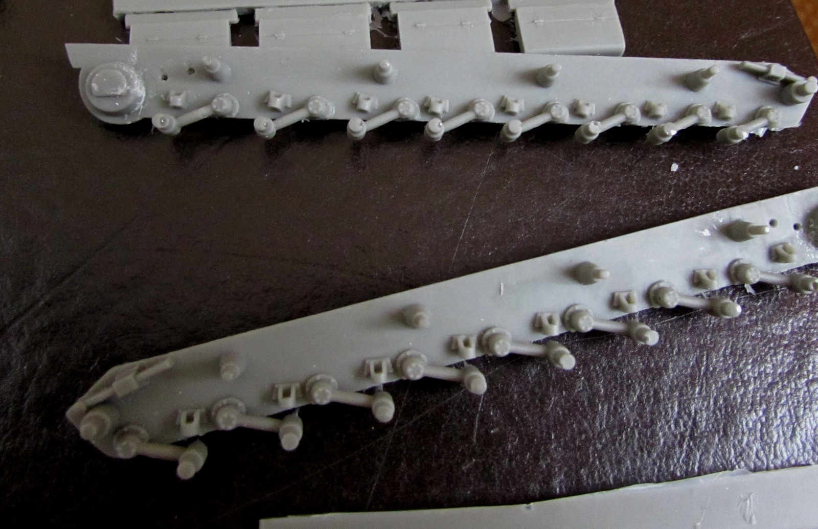 Литье весьма качественное, на 4+, без видимых дефектов (о чем, впрочем, позже). Смола светло-серая, средней дубовости, неплохо режется канцелярским ножом. Главный плюс модели - слабое крепление мелких деталей (катков, звездочек, мелочевки) к литничкам. Вот в этом моменте белорусы обошли даже OKB Grigorov - там катки и многие хрупкие детали утоплены в питатели на 30-40%, из-за чего одно неосторожное движение способно испортить деталь.