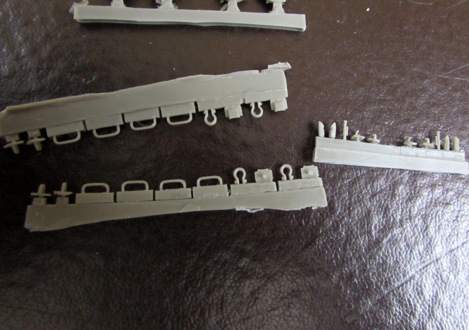 Декалей, естественно, нет. Травления - тоже, и это удручает. Решетка на корме корпуса отлита преотвратно, хоть наклеивай еще одну поверх.