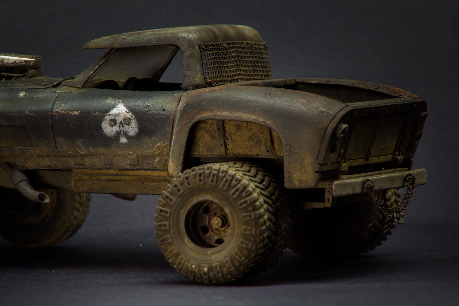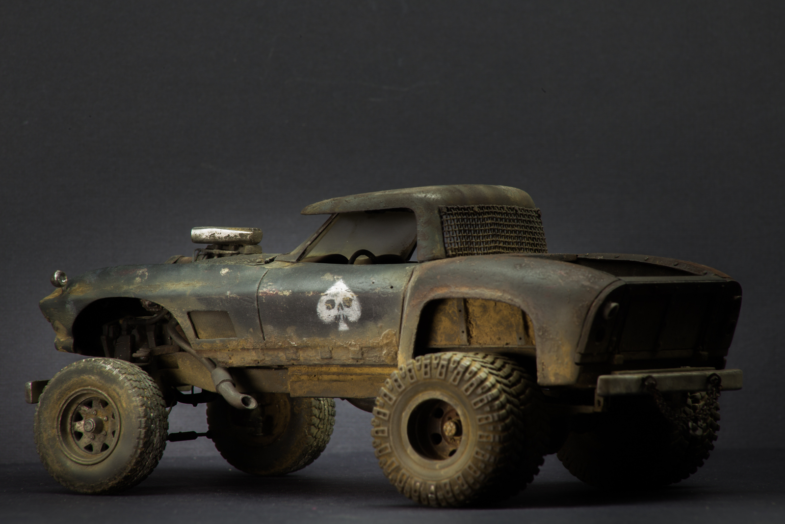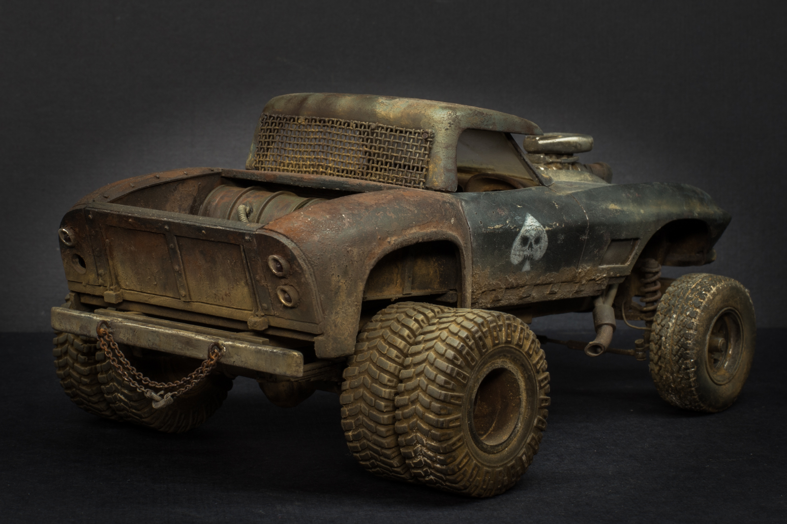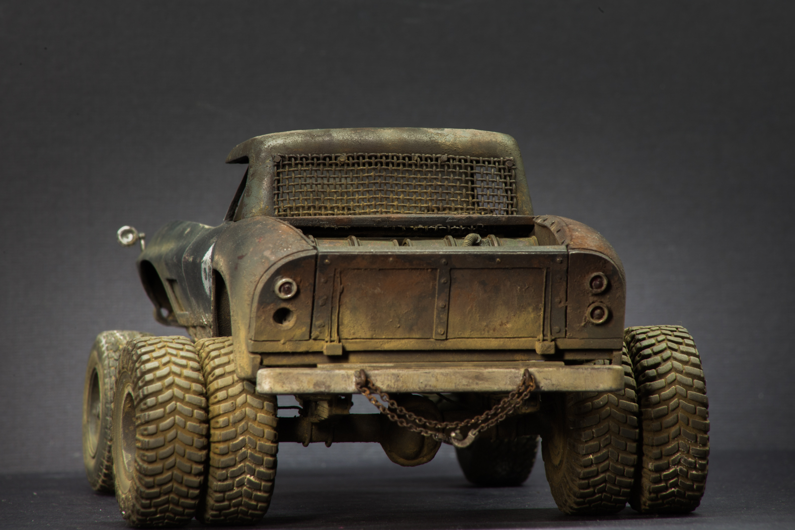 При окраске старался передать разную поверхность двух кузовов - ободранный стеклопластик "Корвета" и ржавый металл крыльев пикапа. Сколы сделал с помощью поваренной соли и окраски в несколько слоев разными цветами.