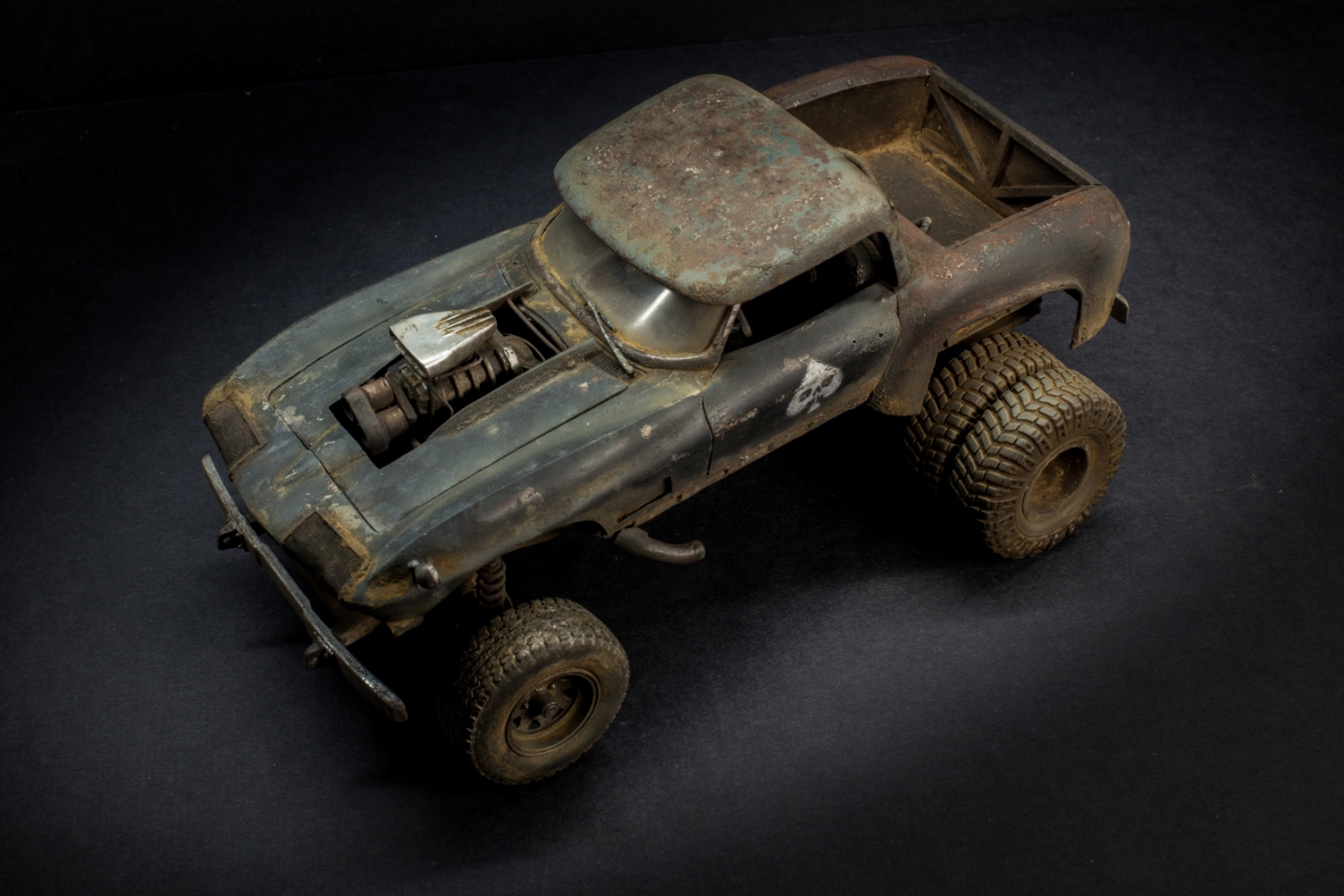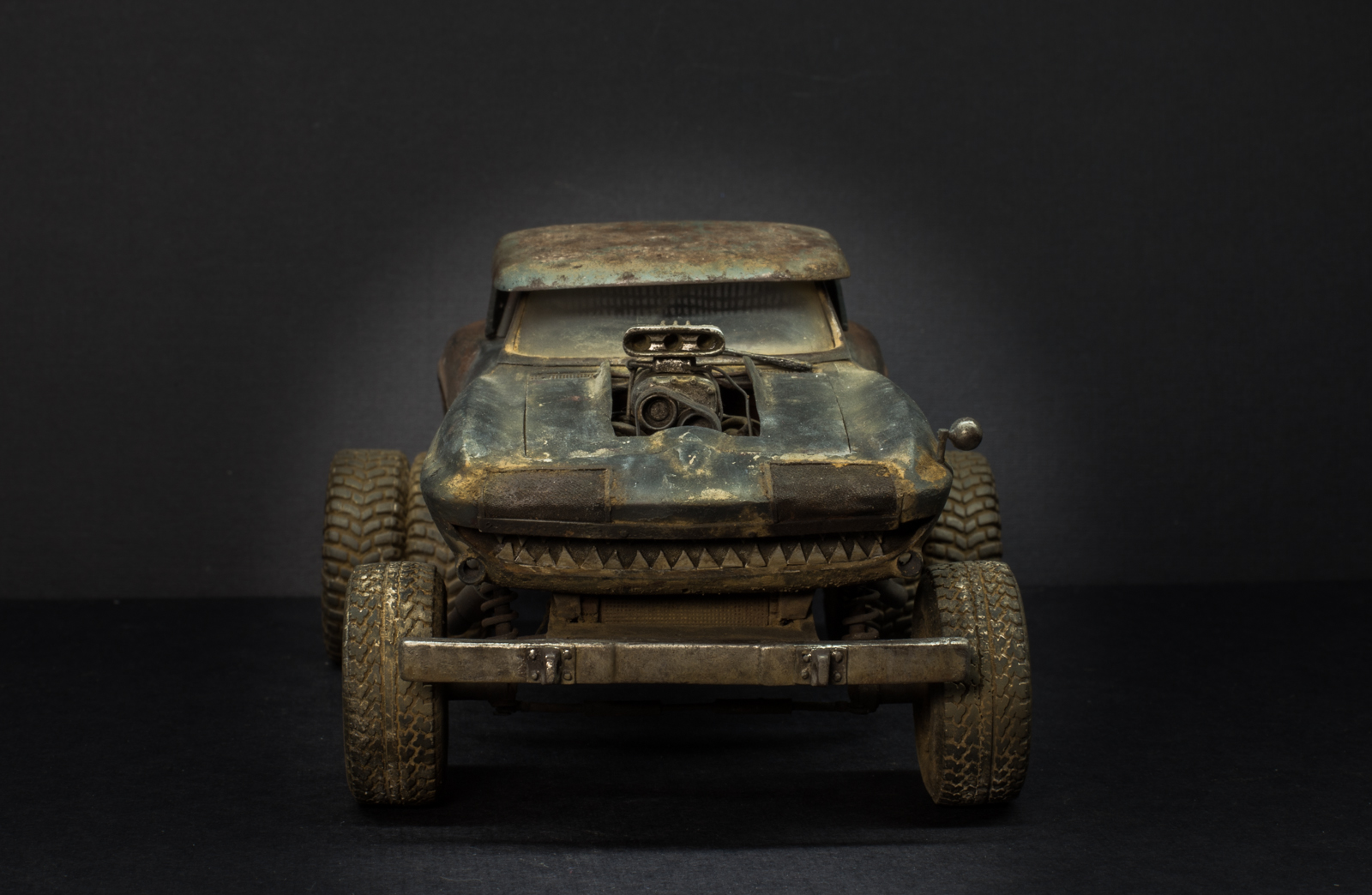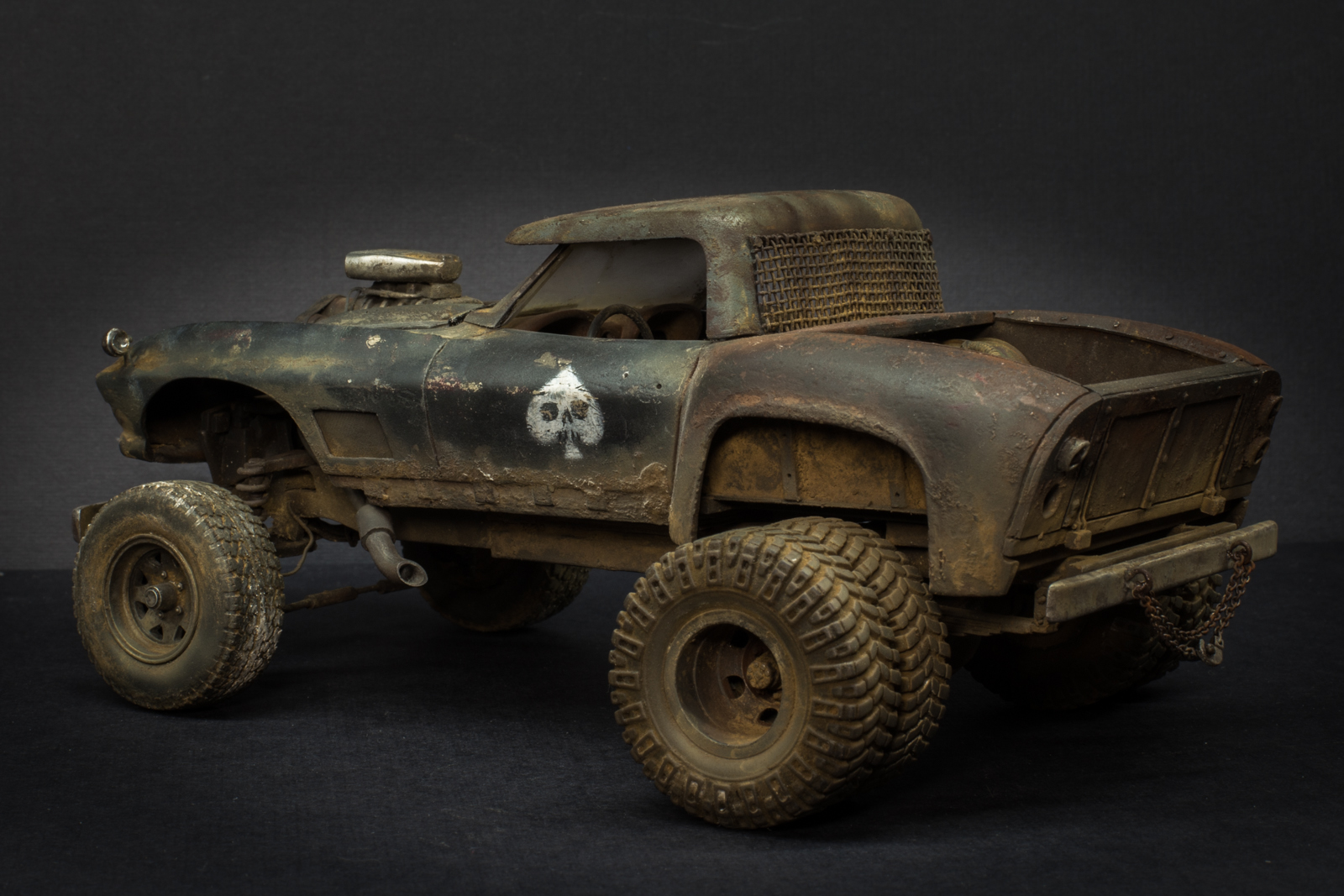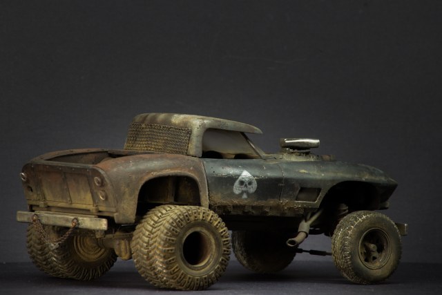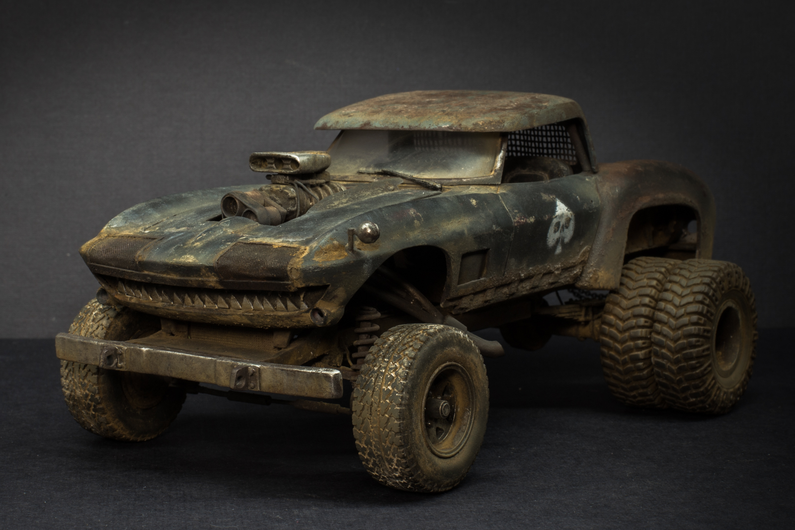 При окраске старался передать разную поверхность двух кузовов - ободранный стеклопластик "Корвета" и ржавый металл крыльев пикапа. Сколы сделал с помощью поваренной соли и окраски в несколько слоев разными цветами.