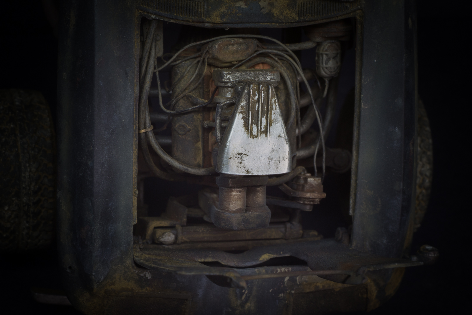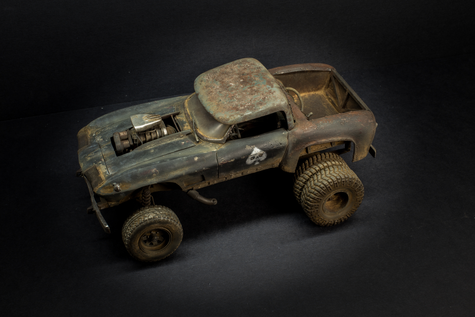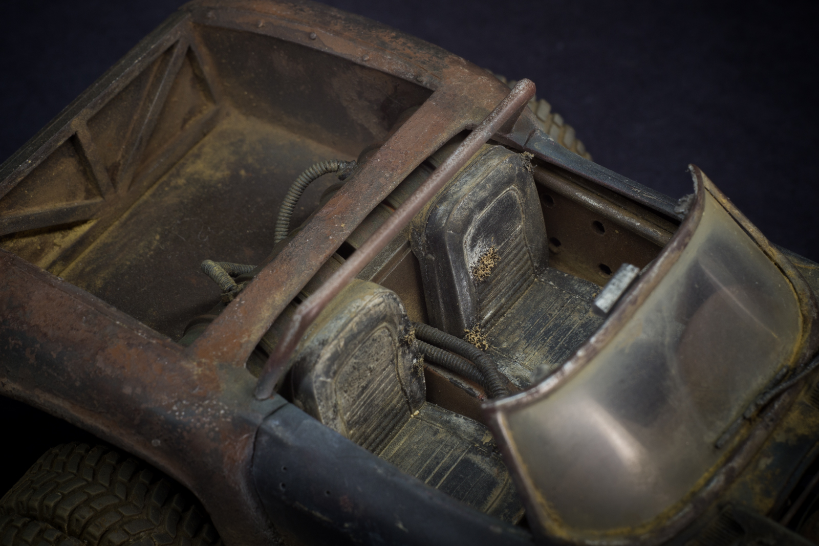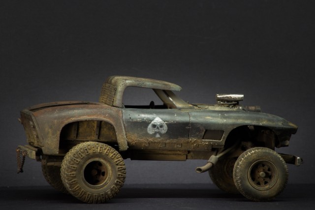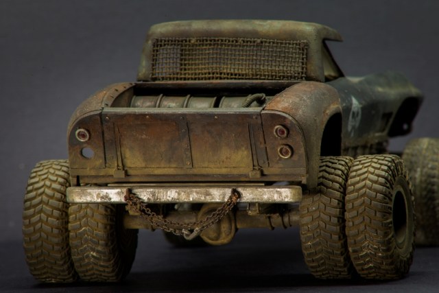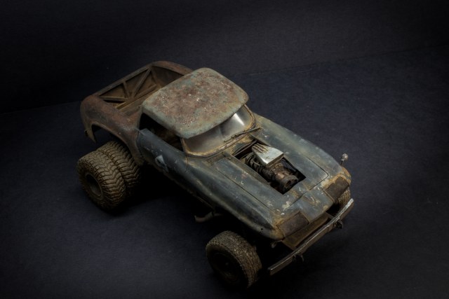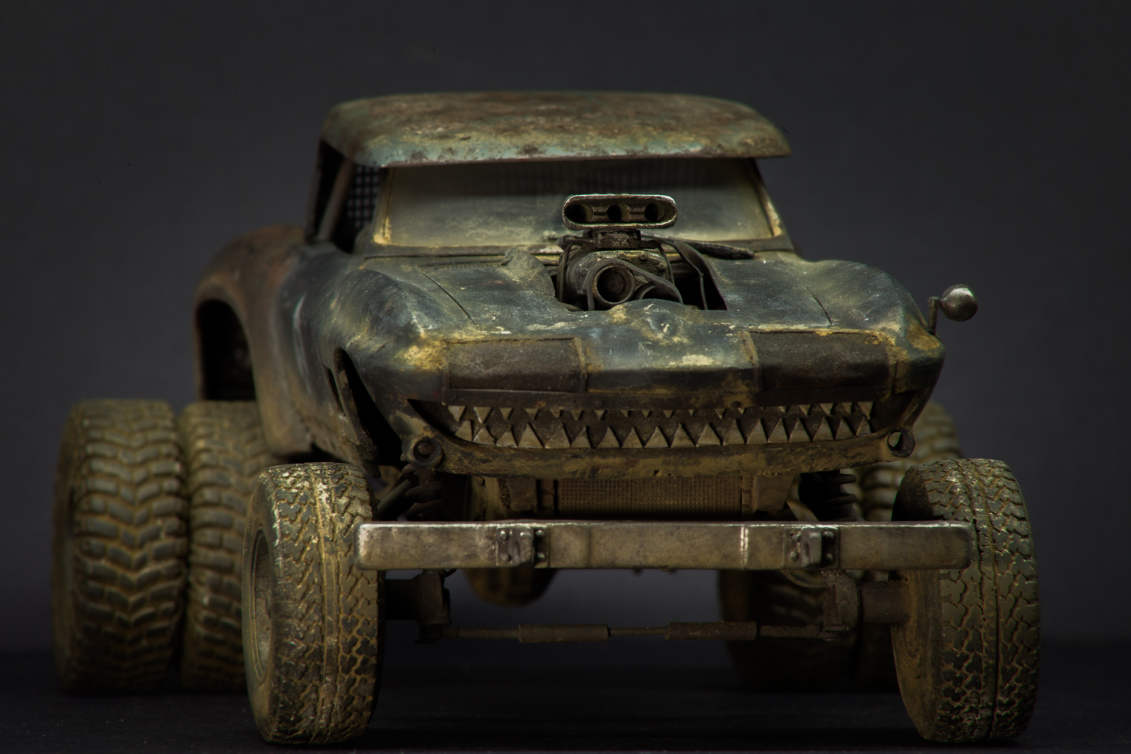При окраске старался передать разную поверхность двух кузовов - ободранный стеклопластик "Корвета" и ржавый металл крыльев пикапа. Сколы сделал с помощью поваренной соли и окраски в несколько слоев разными цветами.