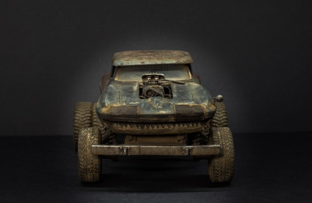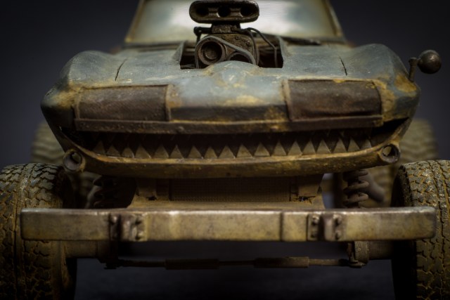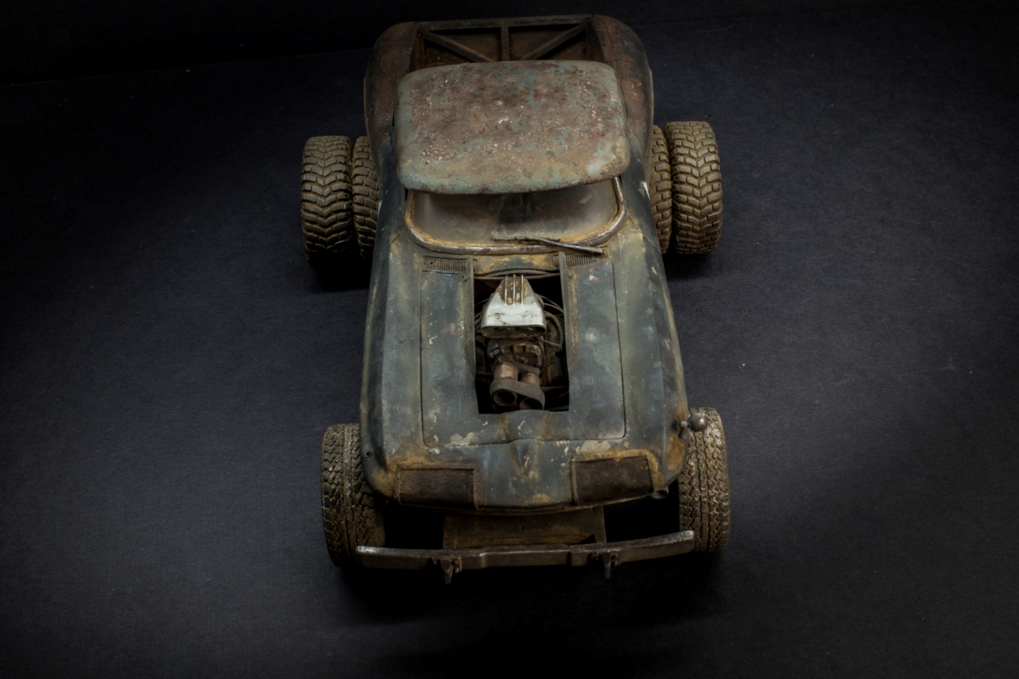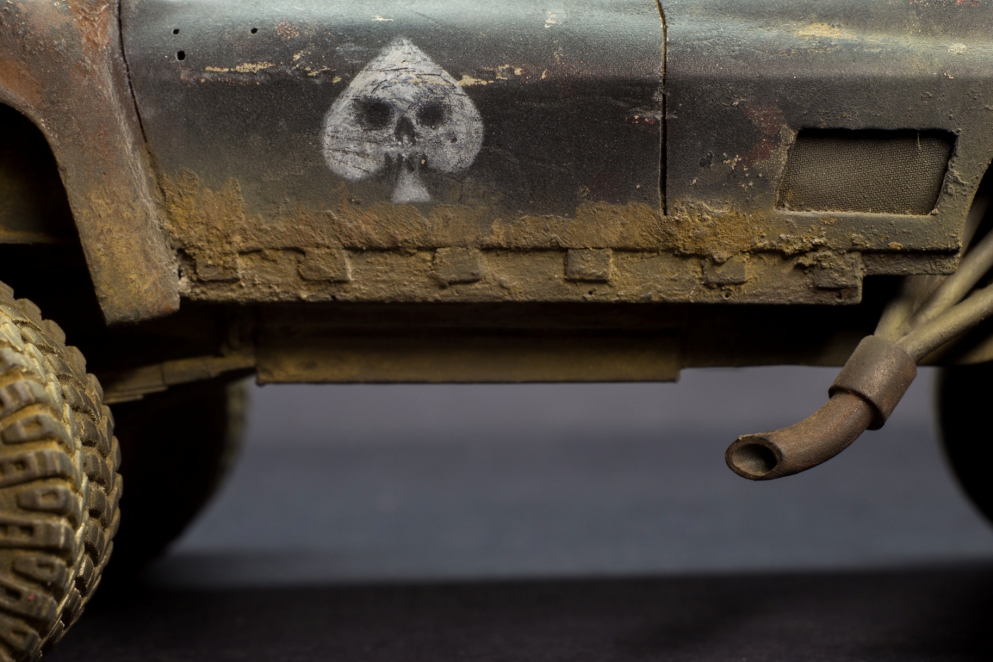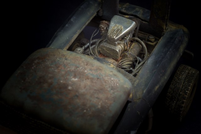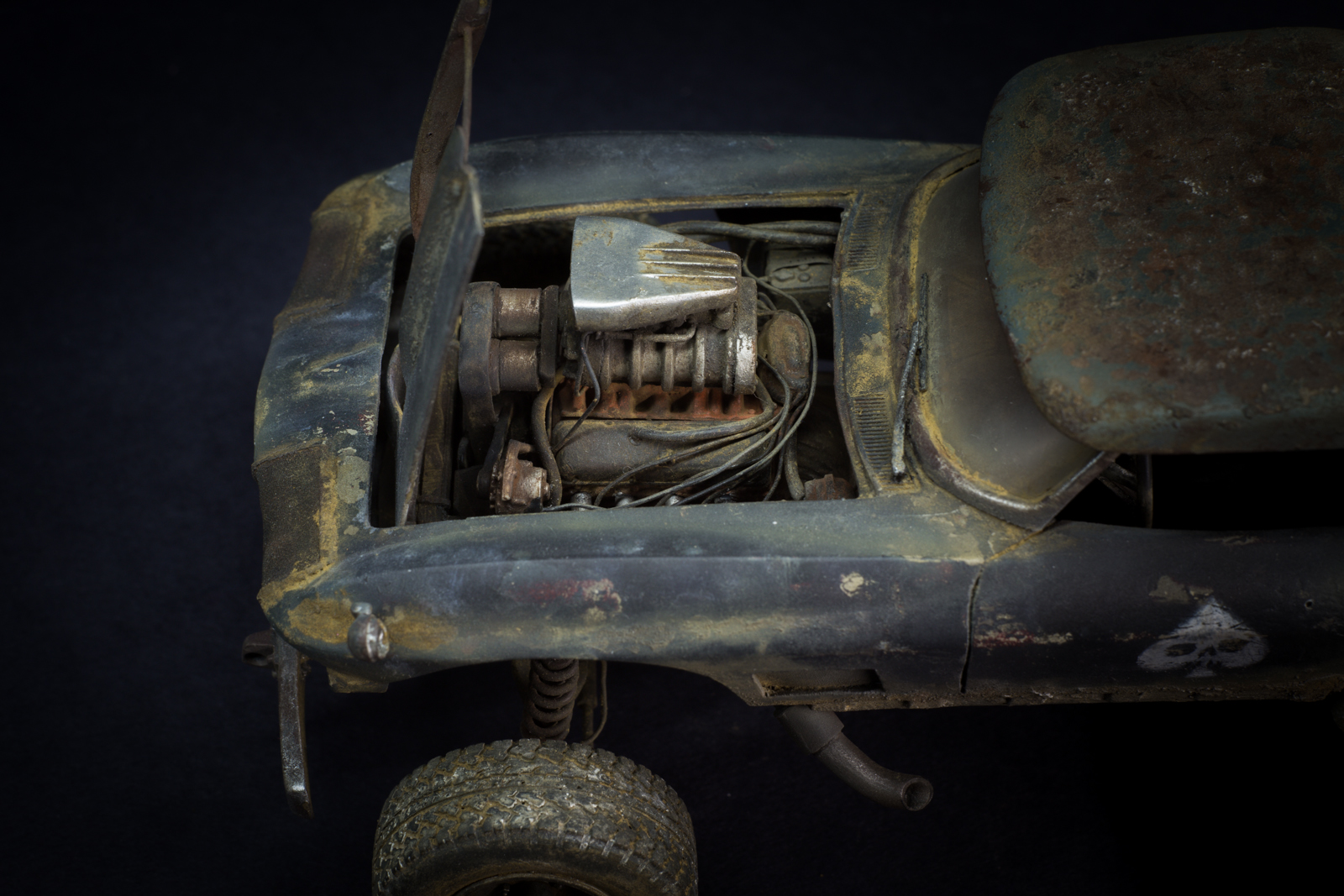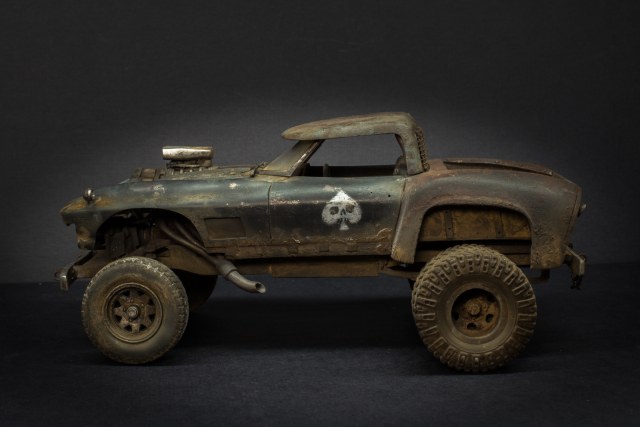При окраске старался передать разную поверхность двух кузовов - ободранный стеклопластик "Корвета" и ржавый металл крыльев пикапа. Сколы сделал с помощью поваренной соли и окраски в несколько слоев разными цветами.