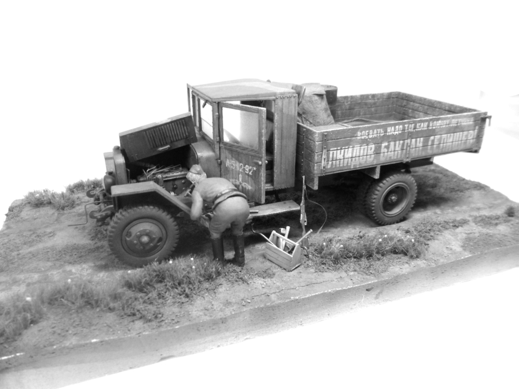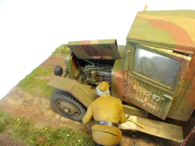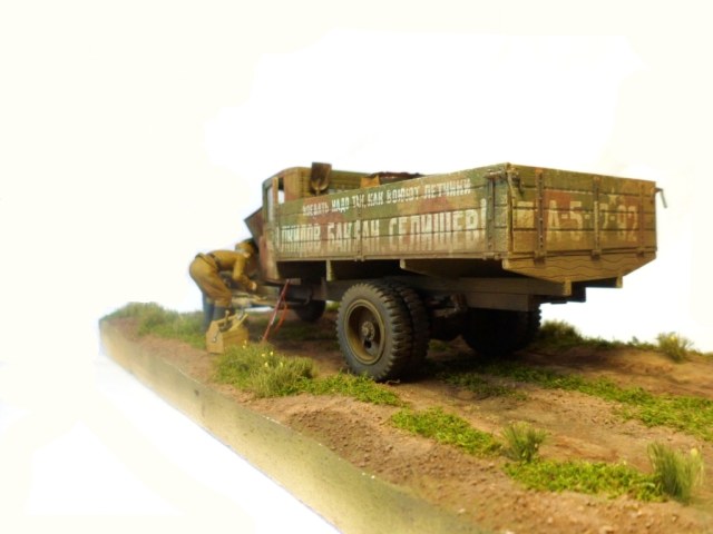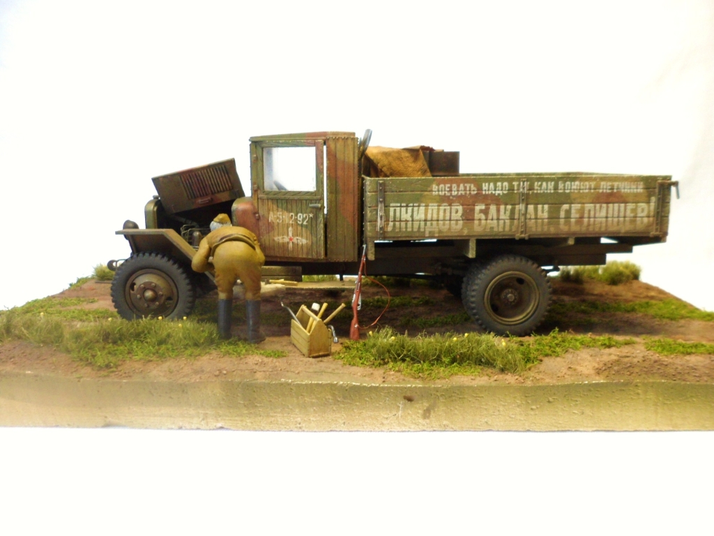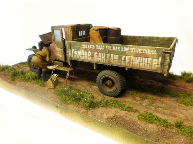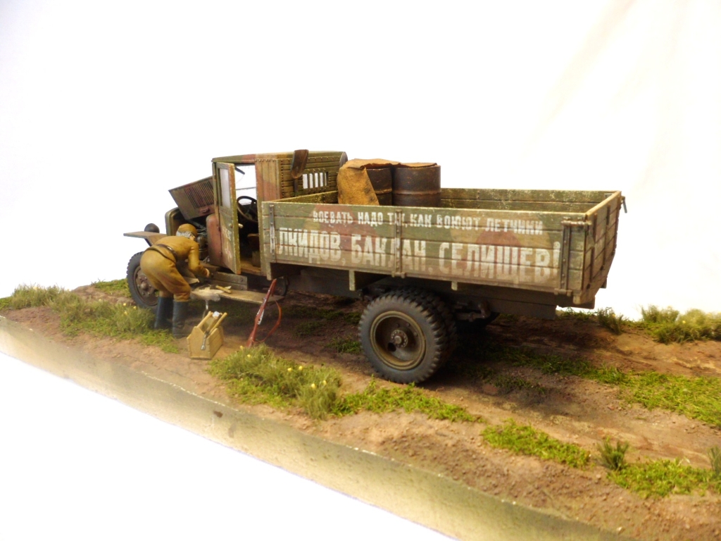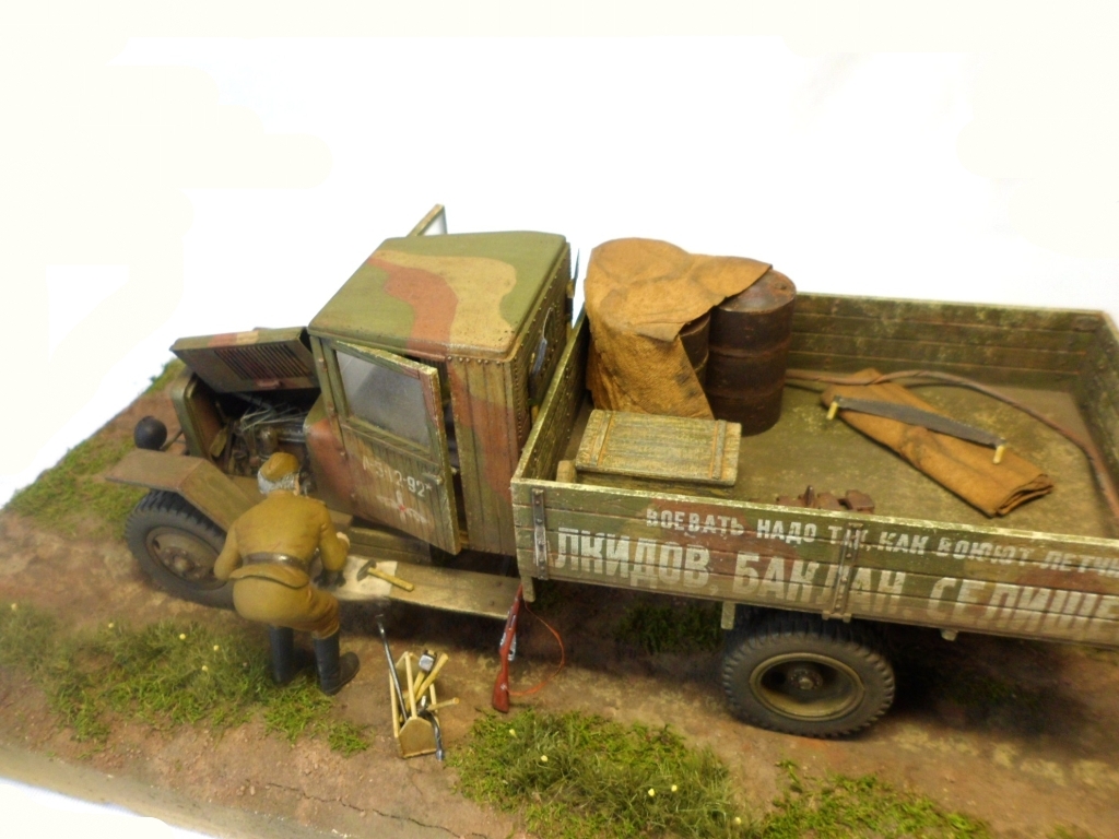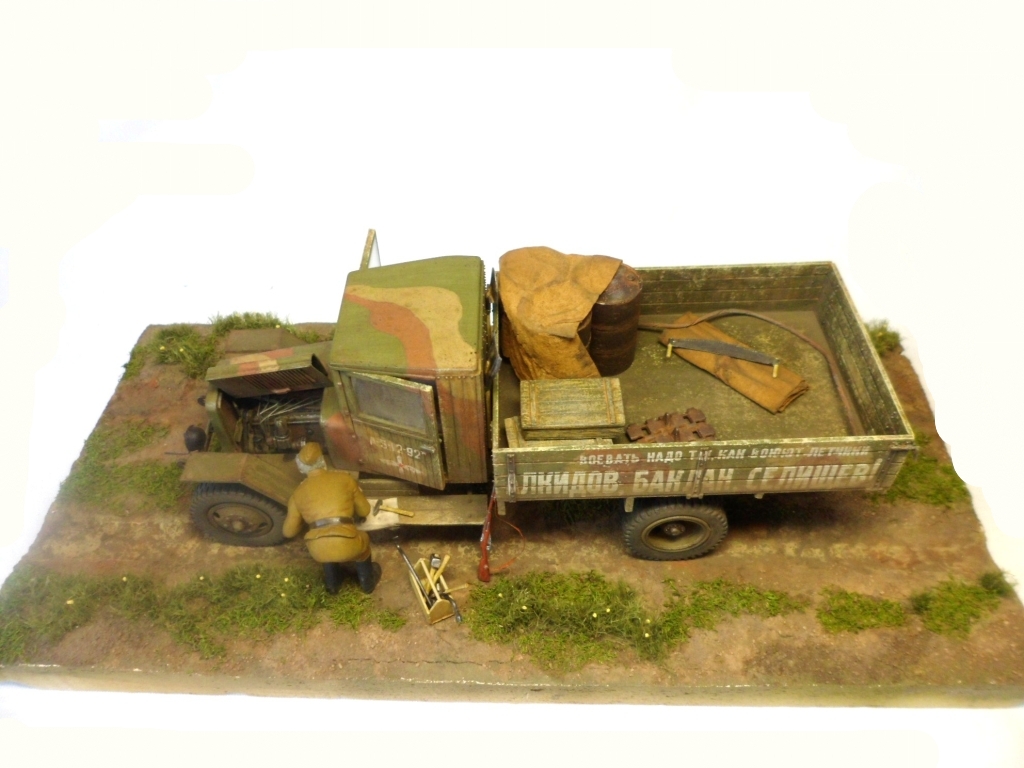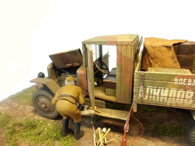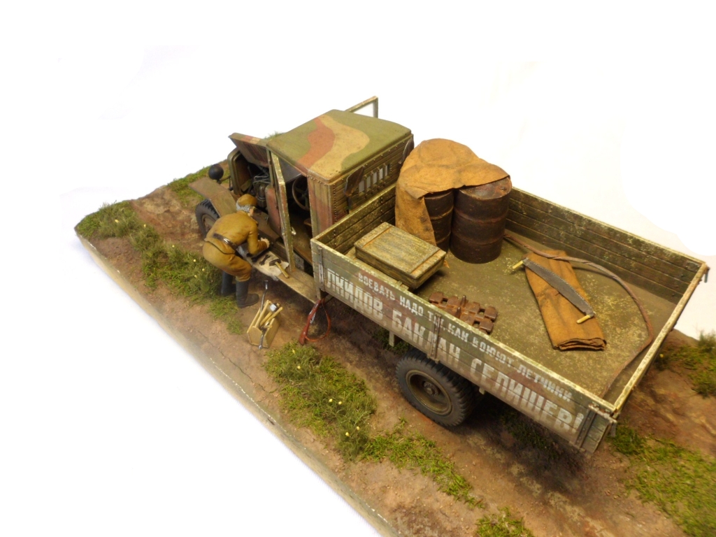 Известная всем модель. Была собрана достаточно давно. При сборке немножко оживил двигатель, двери сделаны рабочими. Водитель из набора, внутрь кабины влезать отказался, поэтому было принято решение сделать небольшую подставку, с незамысловатым сюжетом. Впервые занимался растительностью. В матчасть не вникал, все наполнение самодельное - лопаты, ящик, бочки, ключи, брезент, трос.