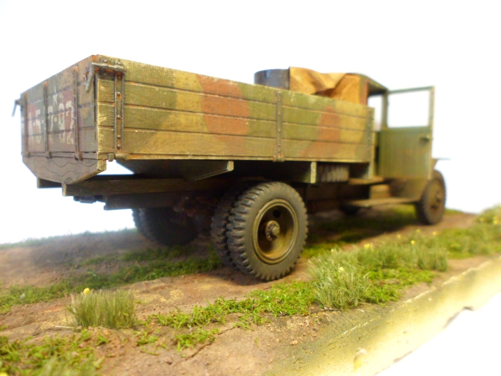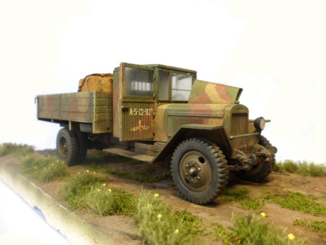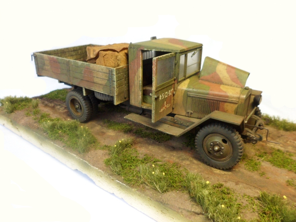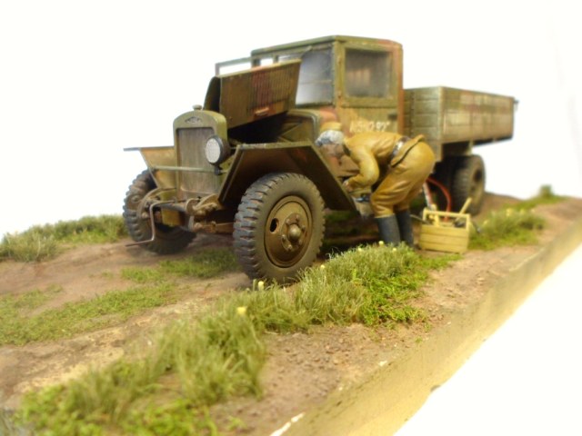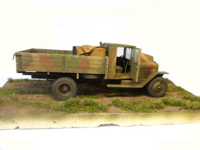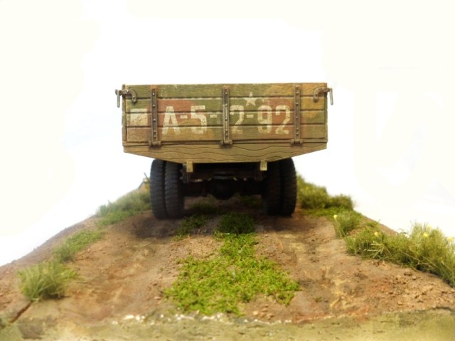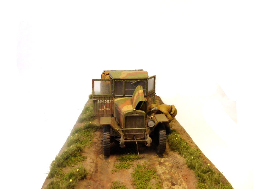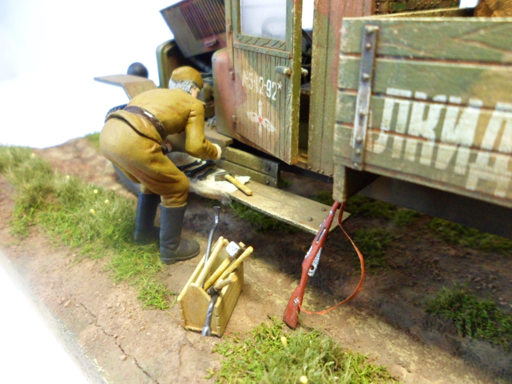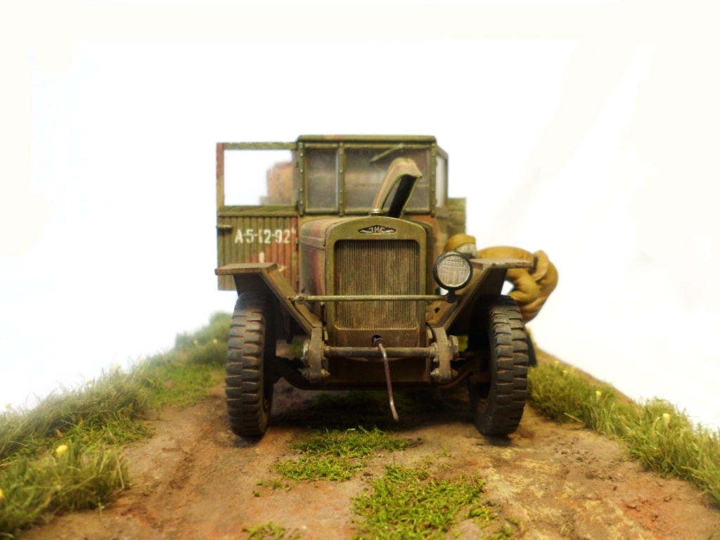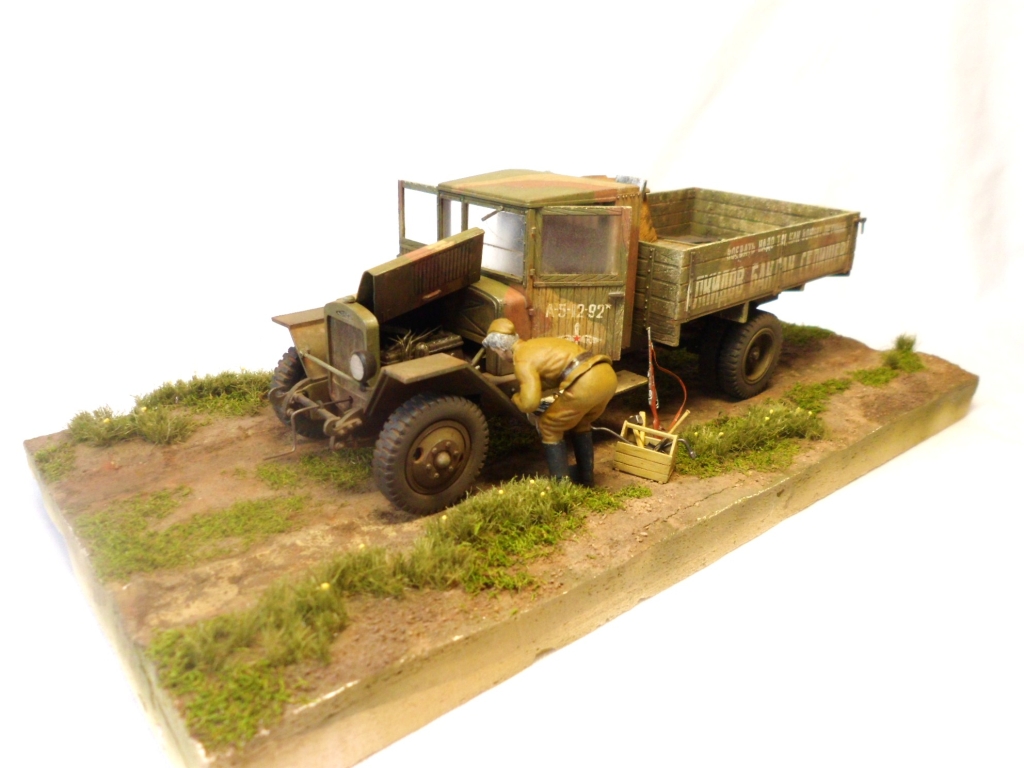 Известная всем модель. Была собрана достаточно давно. При сборке немножко оживил двигатель, двери сделаны рабочими. Водитель из набора, внутрь кабины влезать отказался, поэтому было принято решение сделать небольшую подставку, с незамысловатым сюжетом. Впервые занимался растительностью. В матчасть не вникал, все наполнение самодельное - лопаты, ящик, бочки, ключи, брезент, трос.