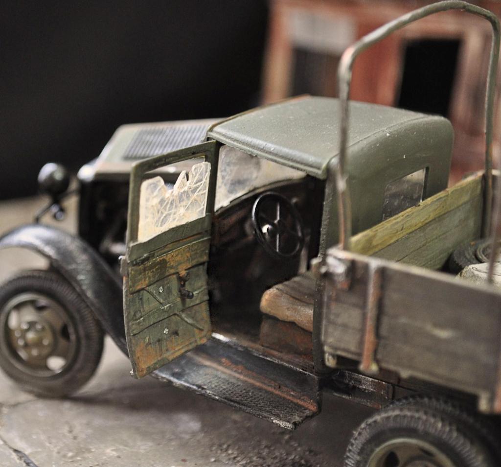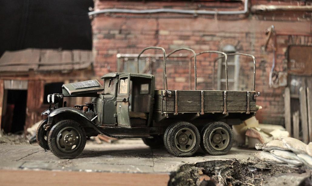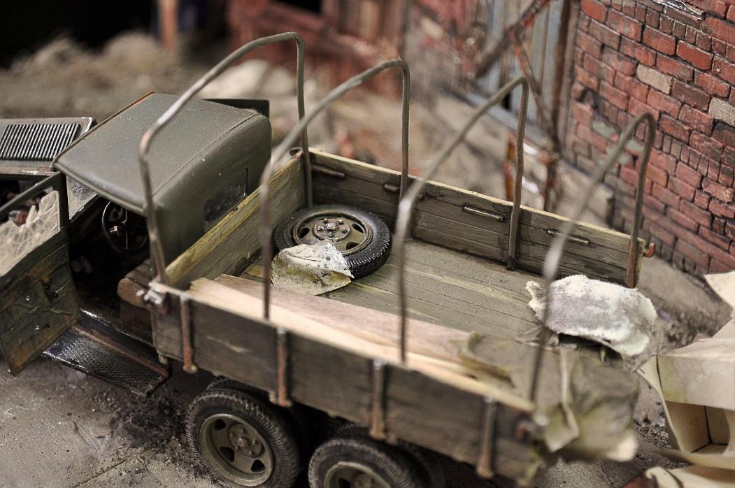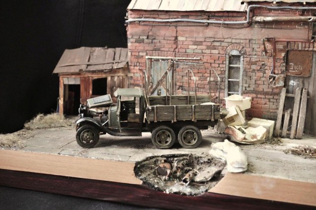 ...Автомобиль сверкает свежей краской на крыльях и почему-то по виду относительно исправен.Короче,диорама вызывает смешанные чувства. Что-то не так,но сразу нащупать не можешь и мучаешься.